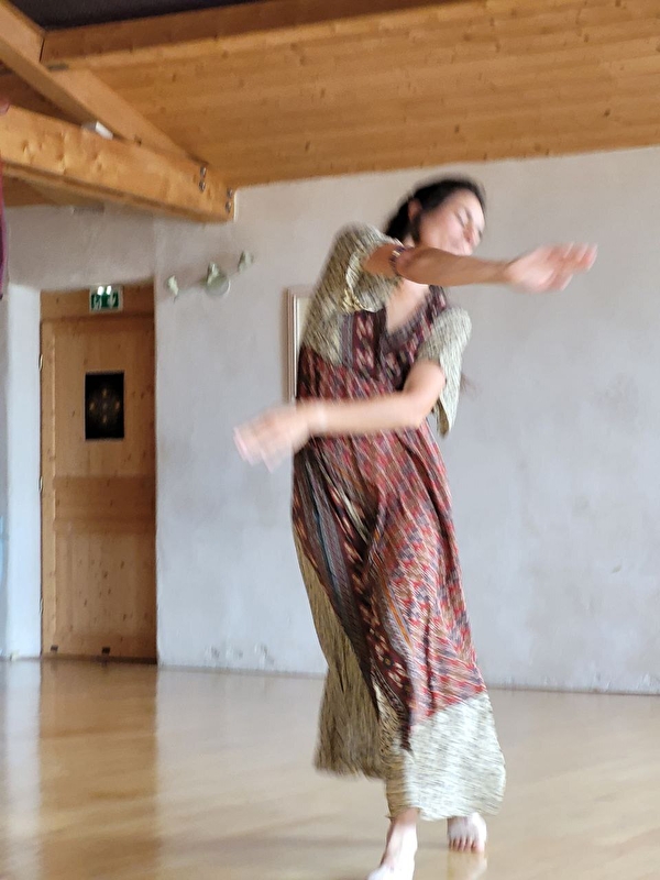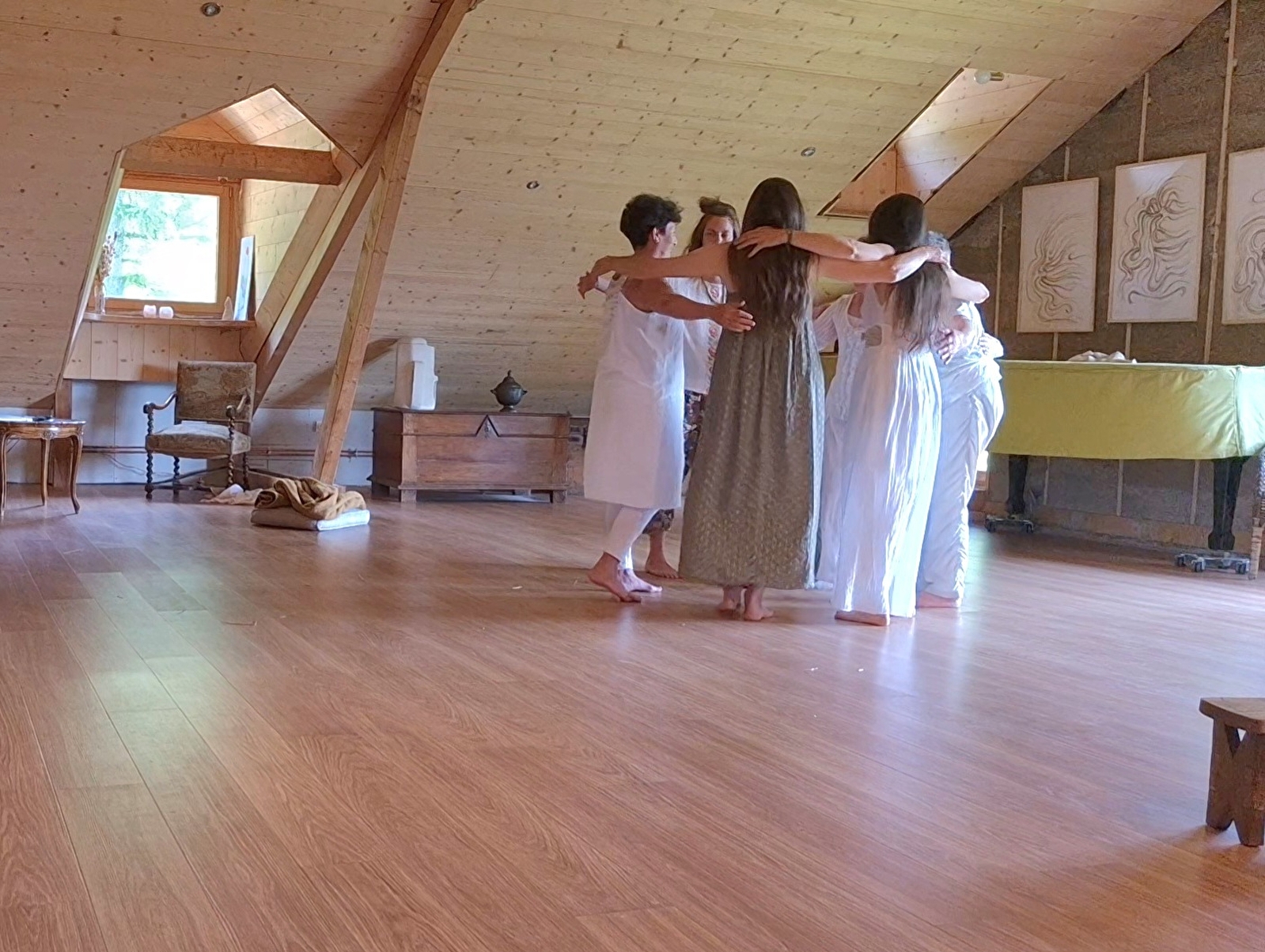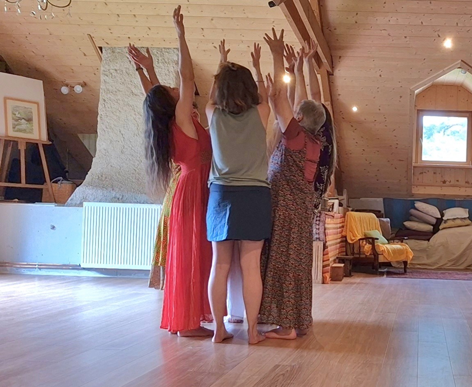 2/ Mouvement : sans musique, puis avec de la musique, ce mouvement spontané est invité à se développer : c'est par la conscientisation avec toutes les fibres de son corps de ce qui fonde chaque être vivant (le souffle, le sol, la lumière, etc...) que notre mental consent à « passer les rênes » au corps.