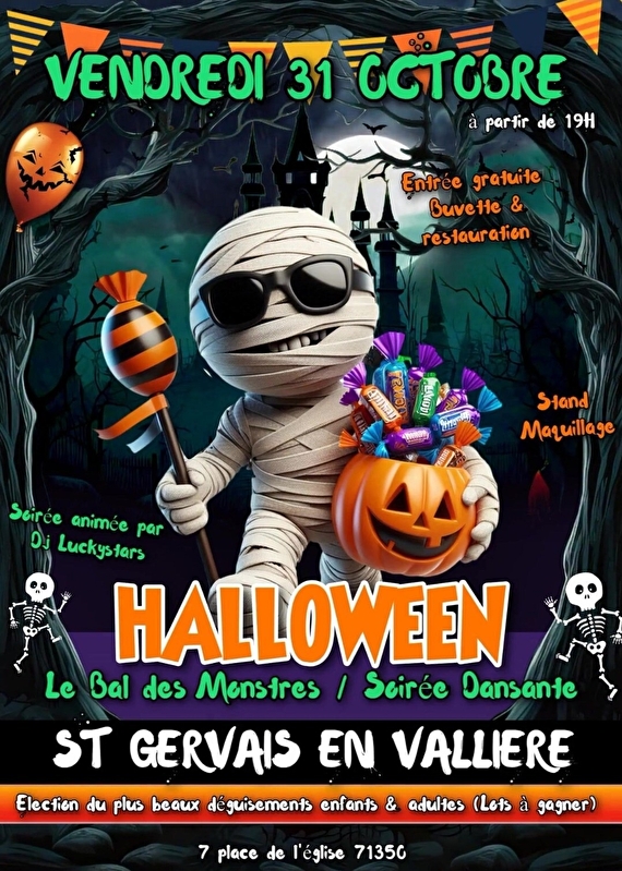 Soirée dansante Le Bal des Monstres : entrée gratuite à partir de 19h. Sur place : stand maquillage, buvette et restauration. Soirée animée par DJ Luckystars et élection du plus beaux déguisements enfants et adultes (Lots à gagner)