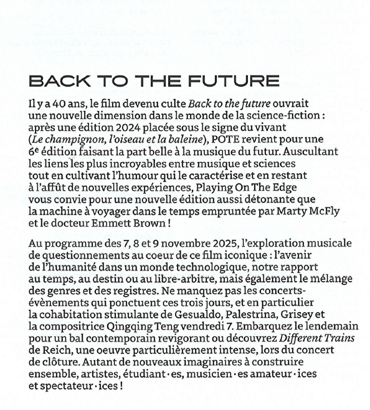 Au programme des 7, 8 et 9 novembre 2025, l’exploration musicale de questionnements au cœur de ce film iconique : l’avenir de l’humanité dans un monde technologique, notre rapport au temps, au destin ou au libre-arbitre, mais également le mélange des genres et des registres. Ne manquez pas les concerts évènements qui ponctuent ces trois jours, et en particulier la cohabitation stimulante de Gesualdo, Palestrina, Grisey et la compositrice Qingqing Teng vendredi 7.