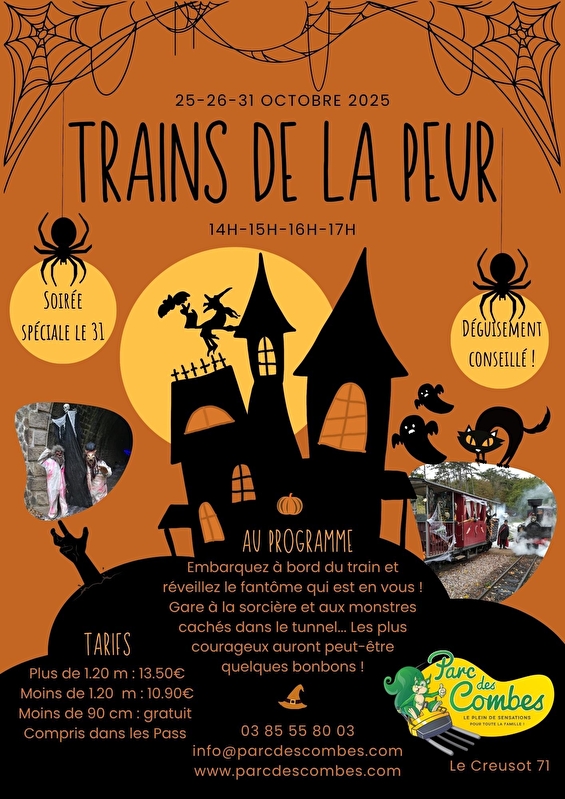 Trains spéciaux en après-midi au Parc des Combes durant les vacances de la Toussaint avec le tunnel hanté et la sorcière des Combes accompagnée de sa marmite pleine de bonbons ! Sans réservation, rendez-vous directement au Parc des Combes.