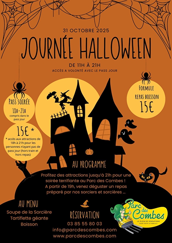 Soirée spéciale le 31 octobre avec soupe de la sorcière, tartiflette géante, puis nocturne pour accéder aux attractions du parc (réservation sur place le jour même).