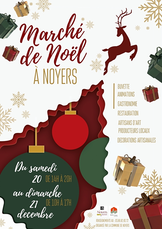 Noyers vous accueille pour son quatrième Marché de Noël ! Venez à la rencontre des artisans et producteurs locaux, pour une journée sous le signe des festivités de Noël ! Idées cadeaux, déco et gastronomie seront à l'honneur pour cette journée festive, avec des activités nombreuses et variées... Le Père Noël a également promis de passer voir les enfants sages (et les autres) ! Nous vous attendons nombreux !