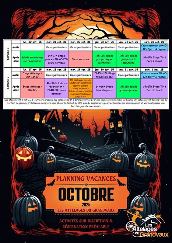 Matériel : chaussures de marche recommandées car elles ont un "talon" pour s'adapter aux étriers (baskets sont fortement déconseillées). Vêtements type: jogging ou pantalon souple, ne craignant pas d'être salis (poussière, boue, poils d'animaux...) et adaptés à la météo (pluie, froid...)