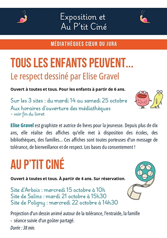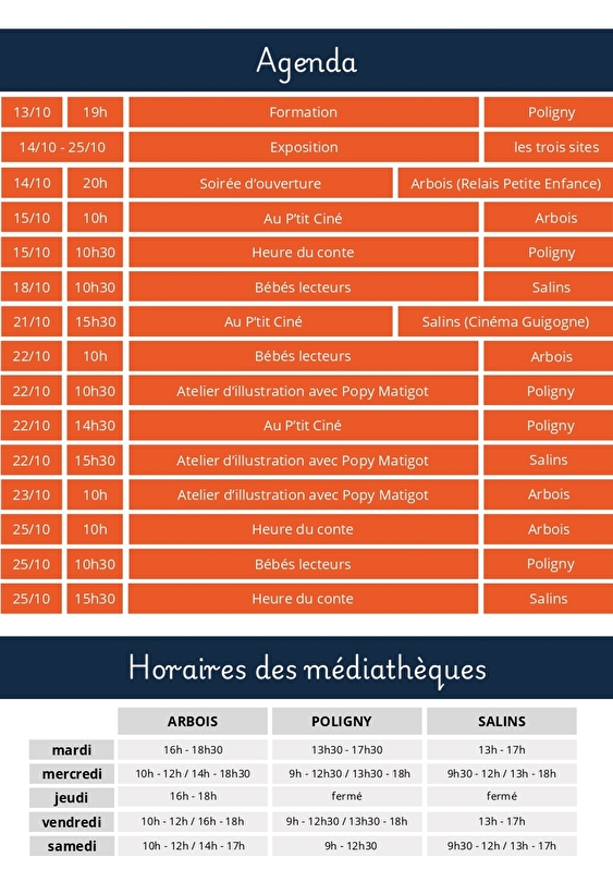 - Bébés lecteurs : Site de Salins : samedi 18 octobre à 10h30. Site d’Arbois : mercredi 22 octobre à 10h. Site de Poligny : samedi 25 octobre à 10h30