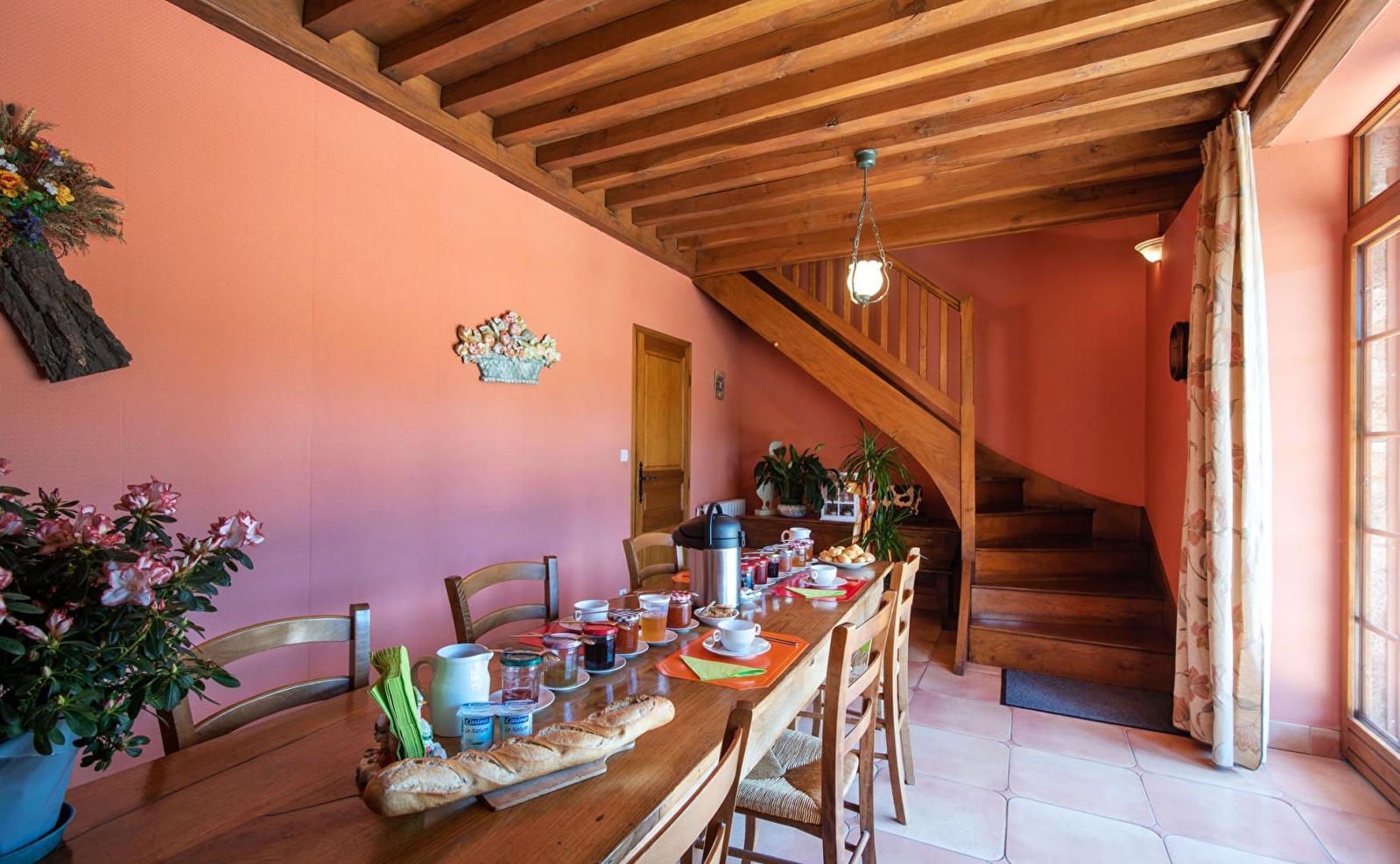 Composition : Maison d'hôtes comprenant 3 chambres au 1er étage (en accès indépendant). Wifi (fibre). Chauffage électrique. Pièce de vie commune au rdc (avec micro-ondes + réfrigérateur). 2 chambres "double" (lit 2 p. 140x190cm dans chacune) avec salle d'eau privée (douche/Wc). 1 chambre familiale composée de 2 chambres indépendantes et communicantes (lit 2 p. 140x190cm + 1 lit 1 p. 90x190cm) avec salle de bain privée (baignoire/Wc indépendant). Double jardin. Parking privé + local vélos. Restaurant 4 km. Commodités dont supermarché à 15 km.