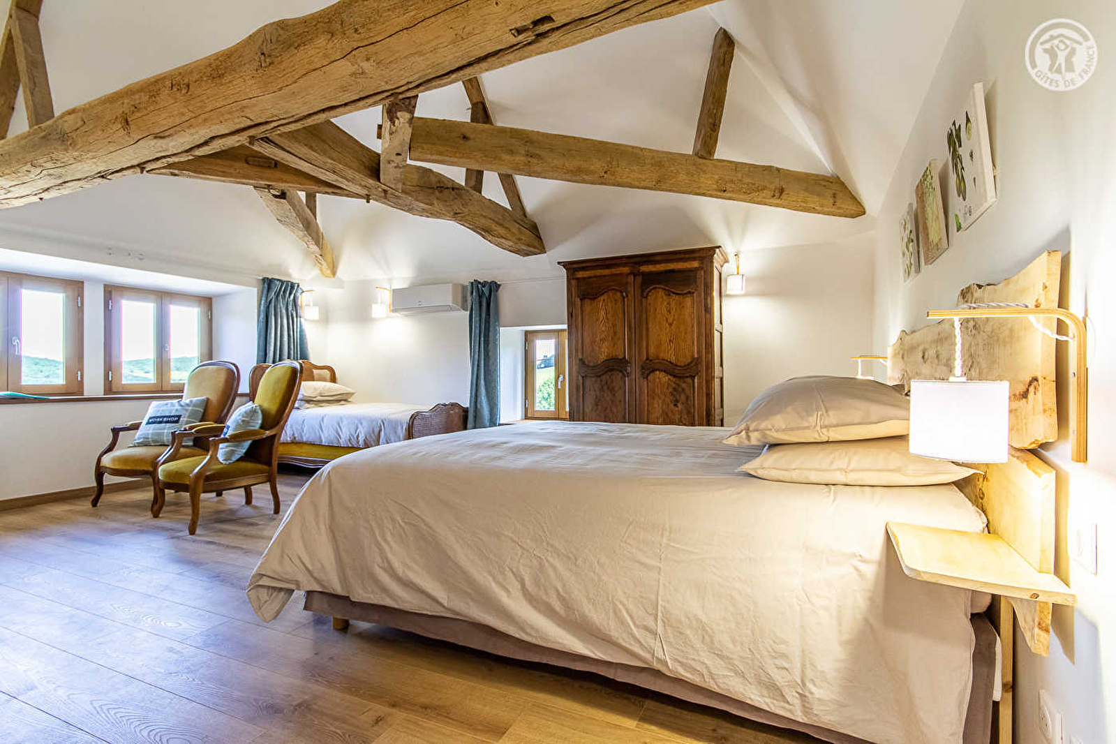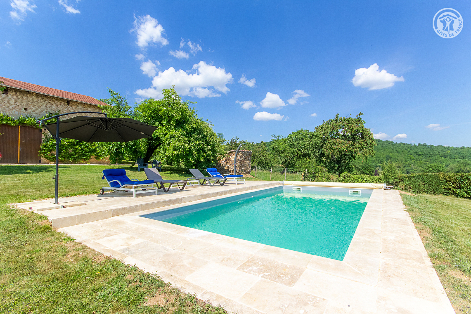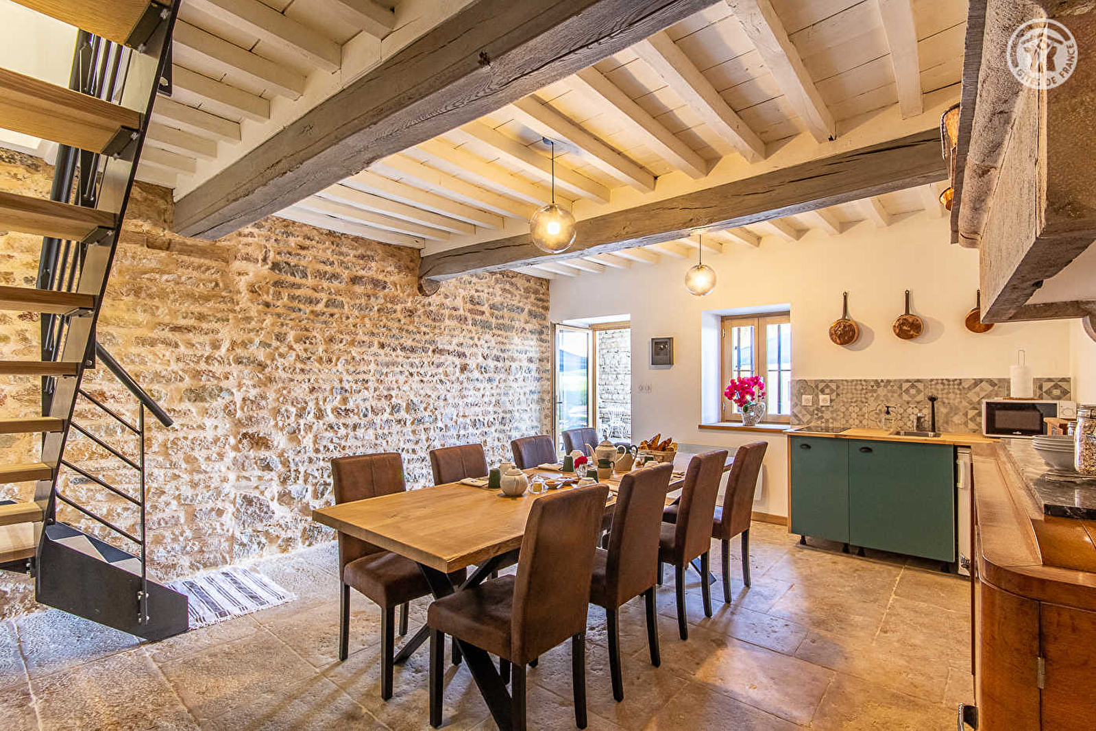 Authentique demeure bourguignonne de caractère du 19ème siècle restaurée dans les règles de l'art & chargée d'histoire (dépendances d'un château voisin, tour à tour « tuilerie », domaine viticole puis ferme) lovée au sein d'un petit hameau rural. Calme absolu au creux d'un magnifique vallon préservé face aux vignobles, à fleur de prairies & forêt (avec vaches & moutons comme seuls voisins !), adossé à une colline boisée dont les crêtes offrent un exceptionnel panorama dont une vue sur le Mont-Blanc par temps clair ! Cadre bucolique enchanteur, véritable écrin préservé de nature & verdure, jouxtant le charmant petit village viticole & commerçant d'Azé (église romane classée du XIème, tour du XVIème, château médiéval du XIIIème, moulins à eau, habitations bourguignonnes traditionnelles…) & ses célèbres grottes toute proche (site préhistorique classé couvrant une période allant de 250 000 à 10 000 ans avant notre ère). Somptueux panorama & paysages. Spacieuses chambres de très bon confort. Chaleureux cachet campagnard alliant l'esprit douillet d'une « maison de famille » à une élégante restauration patrimoniale (conservation des sculpturales charpentes & poutraisons, murs en briques & pierres, sols en pierres de Bourgogne, cheminée…). Énormément de charme & caractère. Ultra cosy. Vaste propriété close & soignée de 2000m² dotée d'une belle piscine avec douche, d'une large terrasse sur cour (exposée & ombragée) et d'un intimiste salon de détente « outdoor » abrité en alcôve.