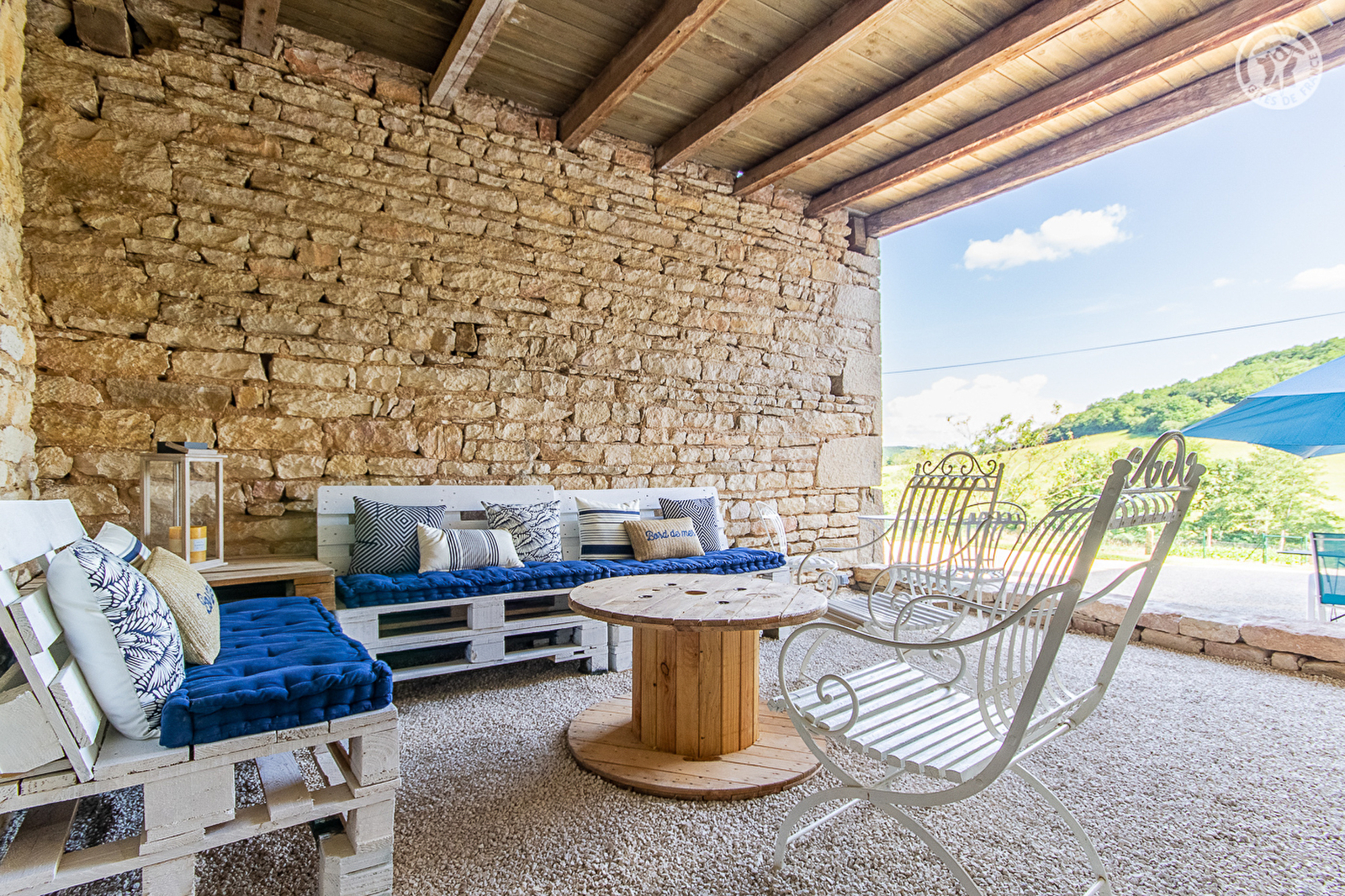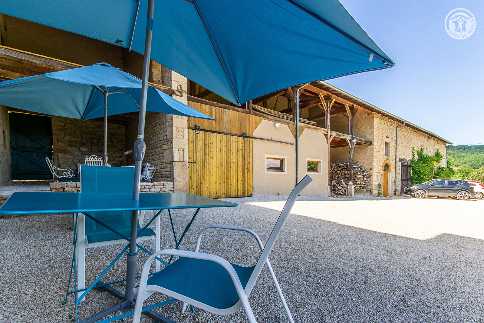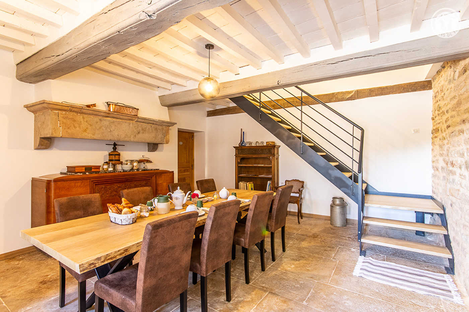 Authentique demeure bourguignonne de caractère du 19ème siècle restaurée dans les règles de l'art & chargée d'histoire (dépendances d'un château voisin, tour à tour « tuilerie », domaine viticole puis ferme) lovée au sein d'un petit hameau rural. Calme absolu au creux d'un magnifique vallon préservé face aux vignobles, à fleur de prairies & forêt (avec vaches & moutons comme seuls voisins !), adossé à une colline boisée dont les crêtes offrent un exceptionnel panorama dont une vue sur le Mont-Blanc par temps clair ! Cadre bucolique enchanteur, véritable écrin préservé de nature & verdure, jouxtant le charmant petit village viticole & commerçant d'Azé (église romane classée du XIème, tour du XVIème, château médiéval du XIIIème, moulins à eau, habitations bourguignonnes traditionnelles…) & ses célèbres grottes toute proche (site préhistorique classé couvrant une période allant de 250 000 à 10 000 ans avant notre ère). Somptueux panorama & paysages. Spacieuses chambres de très bon confort. Chaleureux cachet campagnard alliant l'esprit douillet d'une « maison de famille » à une élégante restauration patrimoniale (conservation des sculpturales charpentes & poutraisons, murs en briques & pierres, sols en pierres de Bourgogne, cheminée…). Énormément de charme & caractère. Ultra cosy. Vaste propriété close & soignée de 2000m² dotée d'une belle piscine avec douche, d'une large terrasse sur cour (exposée & ombragée) et d'un intimiste salon de détente « outdoor » abrité en alcôve.