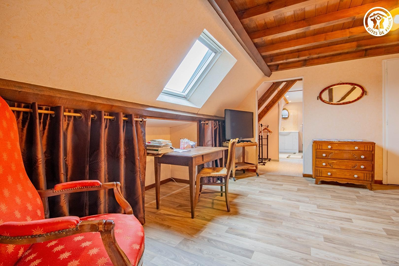 Maryse vous accueille au sein d'une authentique fermette traditionnelle du XIXème intégralement revisitée en confortable maison d'hôtes nichée au calme, en "mini belvédère" à flanc de coteau sud-ouest exposé, sur une petite colline dominant la douce campagne environnante. Au sein d'un paisible hameau résidentiel, proche du centre du pittoresque bourg de Branges blotti sur les rives de la Seille, bucolique rivière poissonneuse protégée en "Zone Natura 2000" & ZNIEFF pour ses remarquables richesses floristiques & faunistiques. Doté d'un port de plaisance fluvial & d'une historique écluse de la fin XVIIIème, offrant l'assurance d'un dépaysant spectacle sans nuisance par le passage de bateaux venus de toute l'Europe en saison, comme la possibilité de location de bateau sans permis, ce ravissant village typique dispose de nombreux petits commerces (dont supérette) & profite d'un apaisant cadre champêtre & naturel préservé, mixant agriculture & pleine nature, entre champs & prairies boisées parsemées de rivières & d'étangs et belles forêts sauvages. Spacieuse chambre familiale lovée sous les toits en mode "cocon". Chaleureux cachet campagnard contemporain sublimé par le squelette des "pans de bois" & la charpente d'origine. Propriété close de 1500m² (portail électrique) dotée d'une grande cour abritant deux espaces tersasse en gravier dont un ombragé sous un boulot & un jardin engazonné, complété par une vaste terrasse abritée en coursive.