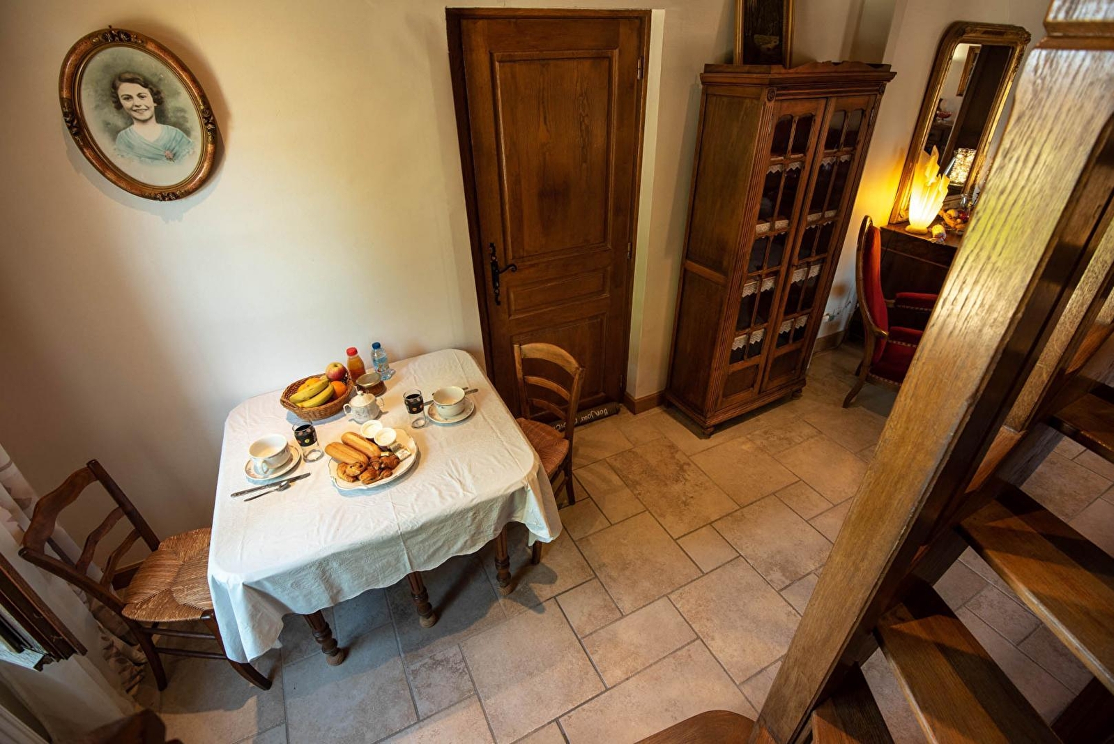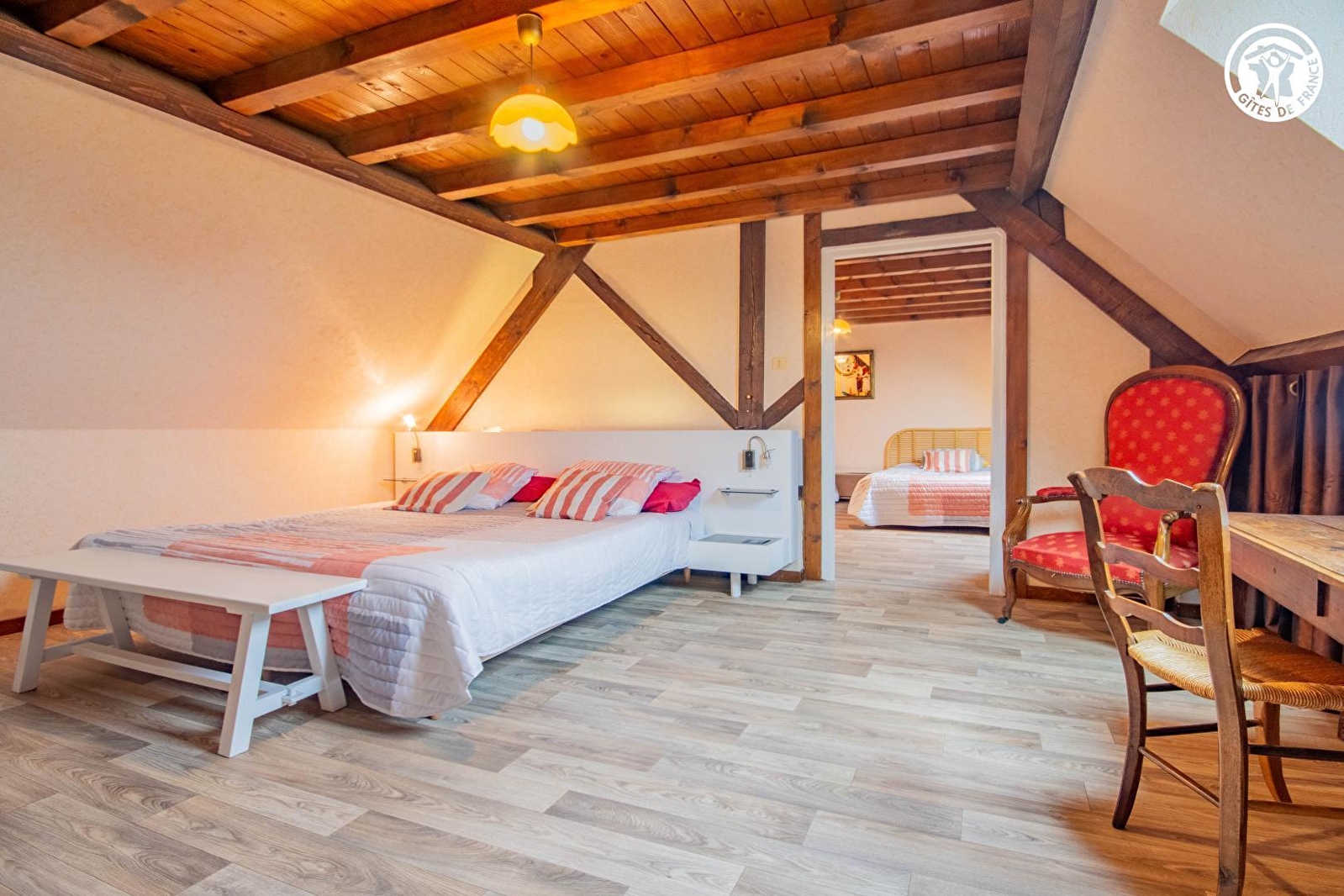 Composition : Chambre familiale au 1er étage (entrée indépendante). Wifi (fibre). Chauffage PAC. Climatisation. 2 chambres communicantes en enfilade (lit 2 p. 180x200cm / lit 2 p. 140x190cm + lit 1 p. 120x190cm) avec TV & salle d'eau privée (douche/Wc indépendant). Kitchenette disponible au rdc (micro-ondes/réfrigérateur/l-linge payant). Pdj & repas pris dans pièce de vie de la propriétaire au rdc. Terrain clos (1500m²). Terrasse abritée + terrasses sur cour (gravier). Abri voiture. Supérette 1.5 km. Supermarché 5 km. Restaurants 6 km.