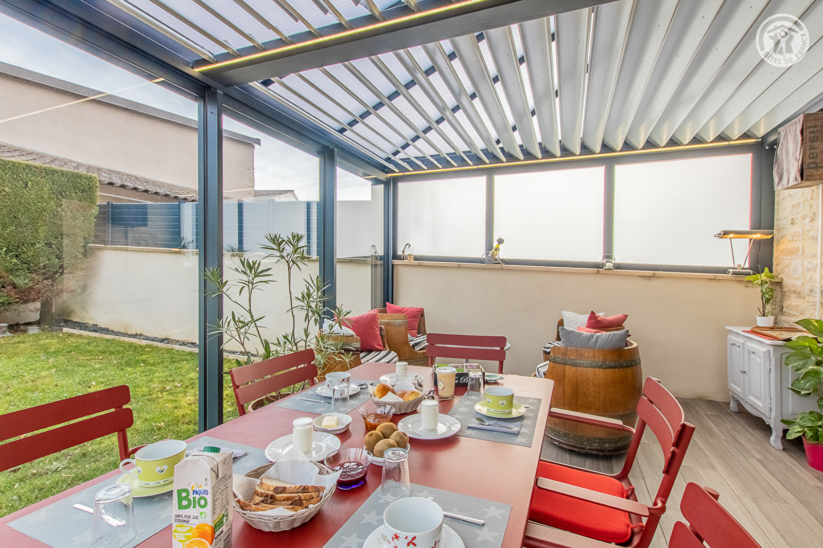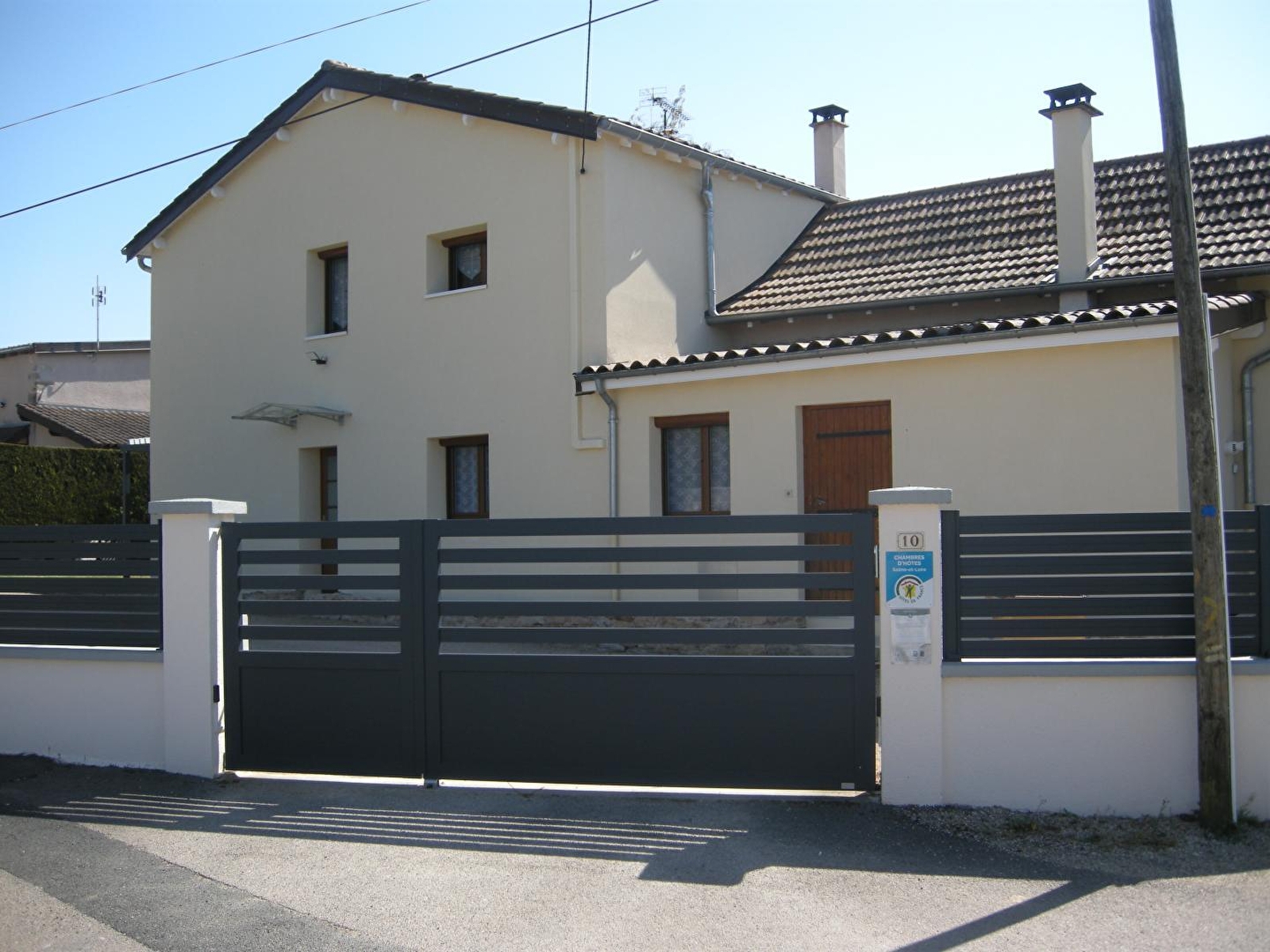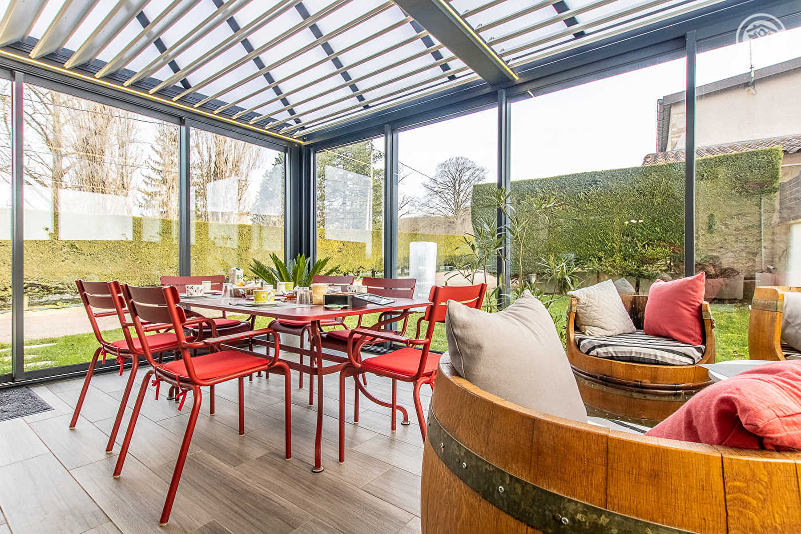 Grange de pays soigneusement restaurée & revisitée en confortable maison d'hôtes, lovée sur un ancien petit domaine agricole niché au cœur du charmant village typique de Charbonnières riche de l'une des plus anciennes chapelles romanes de Bourgogne-Franche-Comté (datée du milieu du Xème siècle). Secteur résidentiel calme & tranquille bordant une paisible petite ruelle à deux pas du centre du bourg. Agréable environnement champêtre, viticole & naturel préservé à découvrir aux alentours, lové au creux de la douce campagne mâconnaise vallonnée & ses célèbres vignobles, succession de coteaux de vignes, forêts, rivières, bocage & prairies. Chambres de très bon confort & totalement indépendantes aménagées dans une annexe historique de la propriété - jouxtant la maison des propriétaires - disposant chacune d'une large terrasse privative. Ambiance chaleureuse & cosy mixant cachet campagnard (chambre "Grège") et esprit contemporain raffiné, sobre & minimaliste, aux inspirations scandinaves zen & douce (chambre "Sauge"). Au sein d'une agréable & intimiste propriété close de 700m² dotée d'une grande cour & d'un petit jardinet (avec portail électrique), d'un local à vélos-motos fermé et sécurisé, d'une pièce commune en accès libre pour restaurer équipée d'un four micro-ondes & d'un réfrigérateur-congélateur et d'une élégante lumineuse véranda accueillant l'espace "petit-déjeuner".