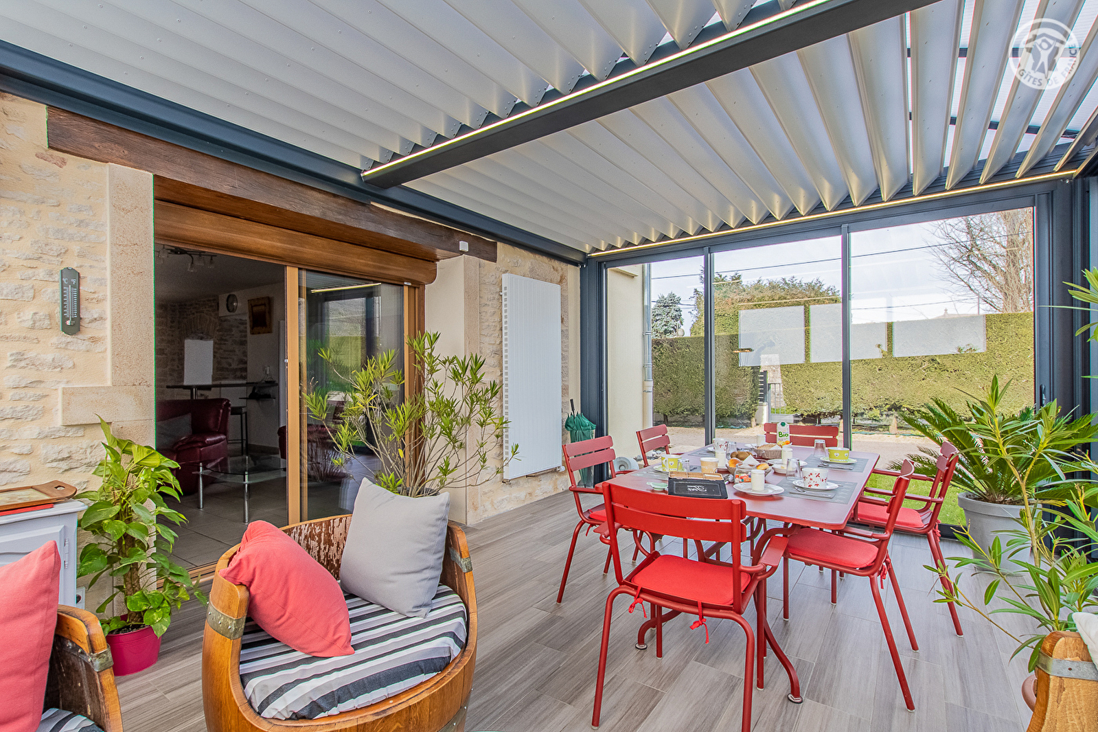 Composition : Annexe totalement indépendante jouxtant la maison des propriétaires. Wifi. Chauffage électrique. Chambres de plain-pied au rdc avec terrasse + TV + salle d'eau privative (douche/wc). Une chambre double au rdc de type "mini suite" avec coin salon (lit 2 p. en 140x190cm). Une chambre familiale (lit 2 p. en 140x190cm + 2 lits 1 p. de 90x190cm). Pièce de vie commune (micro-ondes & réfrigérateur-congélateur) + véranda pour les petits déjeuners aménagée dans la maison propriétaires. Terrain commun clos (cour + jardinet). Local vélos/motos. Parking privé. Commodités 4.5 km. Restaurant 4 km.