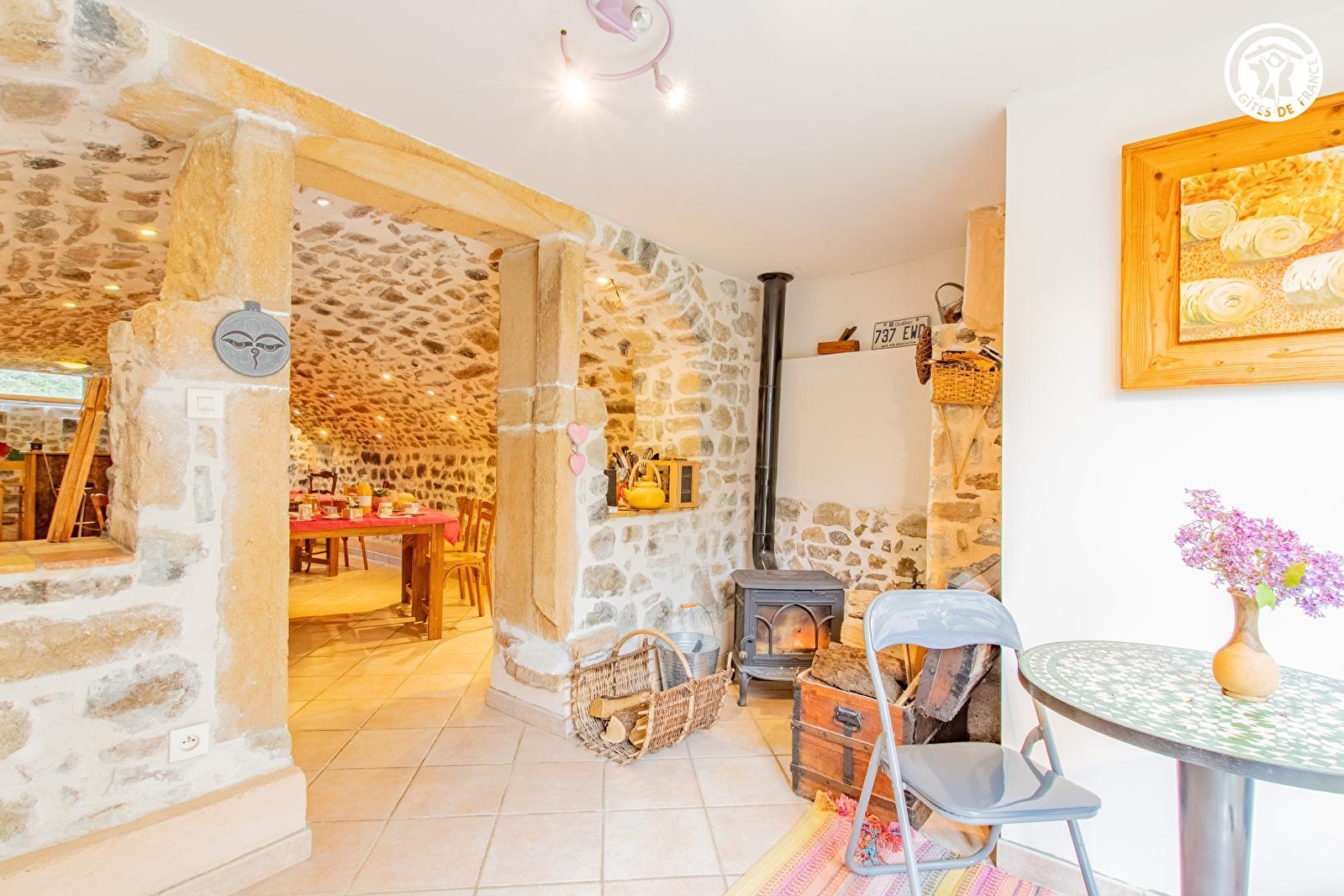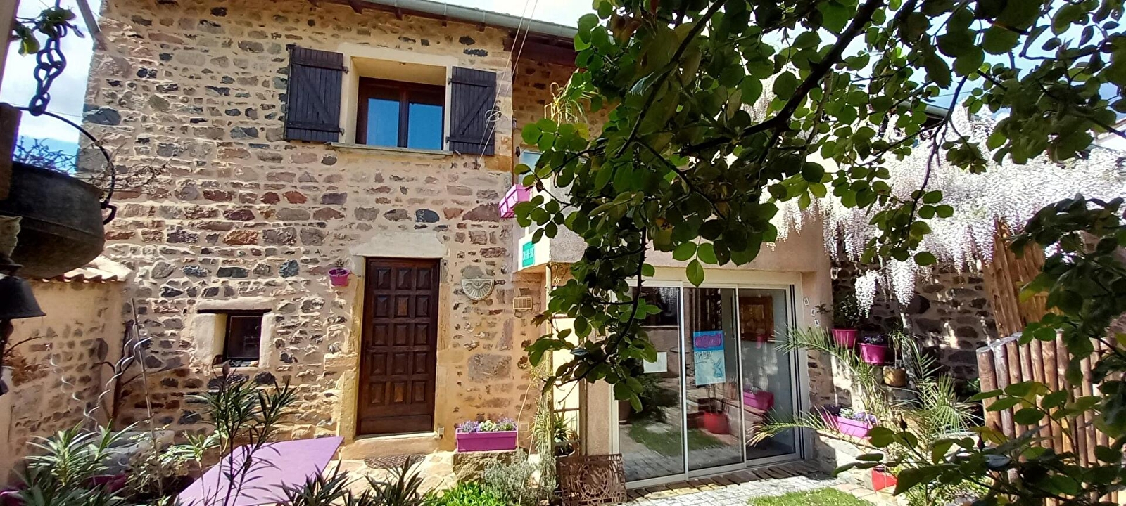 Béatrice vous accueille au sein d'une ravissante authentique fermette traditionnelle de caractère de la fin XIXe intégralement restaurée, blottie au calme en impasse, en lisière des vignes de l'AOC "Juliénas" (l'un des plus septentrionaux des crus du Beaujolais) en pleine campagne préservée de montagne douce. Totale tranquillité bordant une ruelle aux confins d'un paisible petit hameau rural & viticole juché en "belvédère panoramique", à flanc de colline sur un coteau sud, non loin du pittoresque village de Pruzilly dominant en "vigie" (sur un col) le Val de Saône et la Bresse face aux massifs des Alpes & du Vercors (on y aperçoit le Mont-blanc par temps clair !). Sublime écrin viticole alentour, dominant un vaste plateau de vignobles sous les crêtes boisées d'une belle forêt sauvage (site protégé en ZNIEFF pour ses richesses faunistiques & floristiques). Cadre enchanteur, 100% relaxant. Magnifique vue dégagée & panorama avec la chaine du Jura en toile de fond. Chambres de bon confort. Chaleureux cachet campagnard boisé dialoguant avec les linteaux & murs en pierres d'origine. Superbe pièce de vie lovée sous les voûtes en pierres de l'ancienne cave (naturellement rafraîchie l'été). Intimiste courette intérieure close (fleurie & végétalisée) intégrant une terrasse abritée.