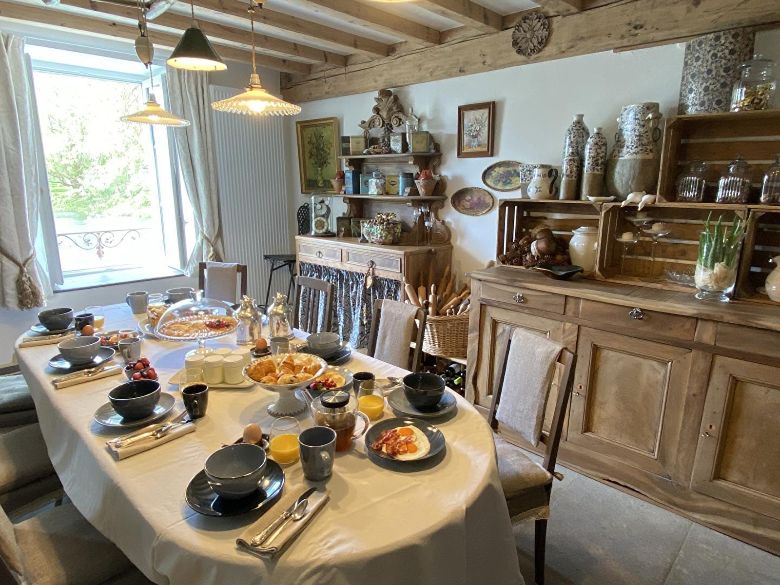 Composition : Wifi (fibre) + TV dans chambres. Climatisation. Chauffage électrique + poêle à granulés bois dans chaque chambre (sauf rdc). Pdj pris dans le séjour de la propriétaire. Pièce de vie dédiée aux hôtes au 2ème étage (billard + baby-foot + espaces détente). Chambre double au rdc niveau 3 épis (2 lits 1 p. 80x200cm jumelables en lit 2 p.) avec salle d'eau privée (douche/Wc indépendant "sur pallier"). 1er étage : 2 suites (lit 2 p. 180x200cm) avec sde privée (douche/Wc indépendant). 2ème étage : 1 suite (lit 2 p. 180x200cm) avec sde privée (douche/Wc indépendant). Jardins + local vélos. Parking privé. Restaurants & commerces 5.5 km. Supermarché 6 km.