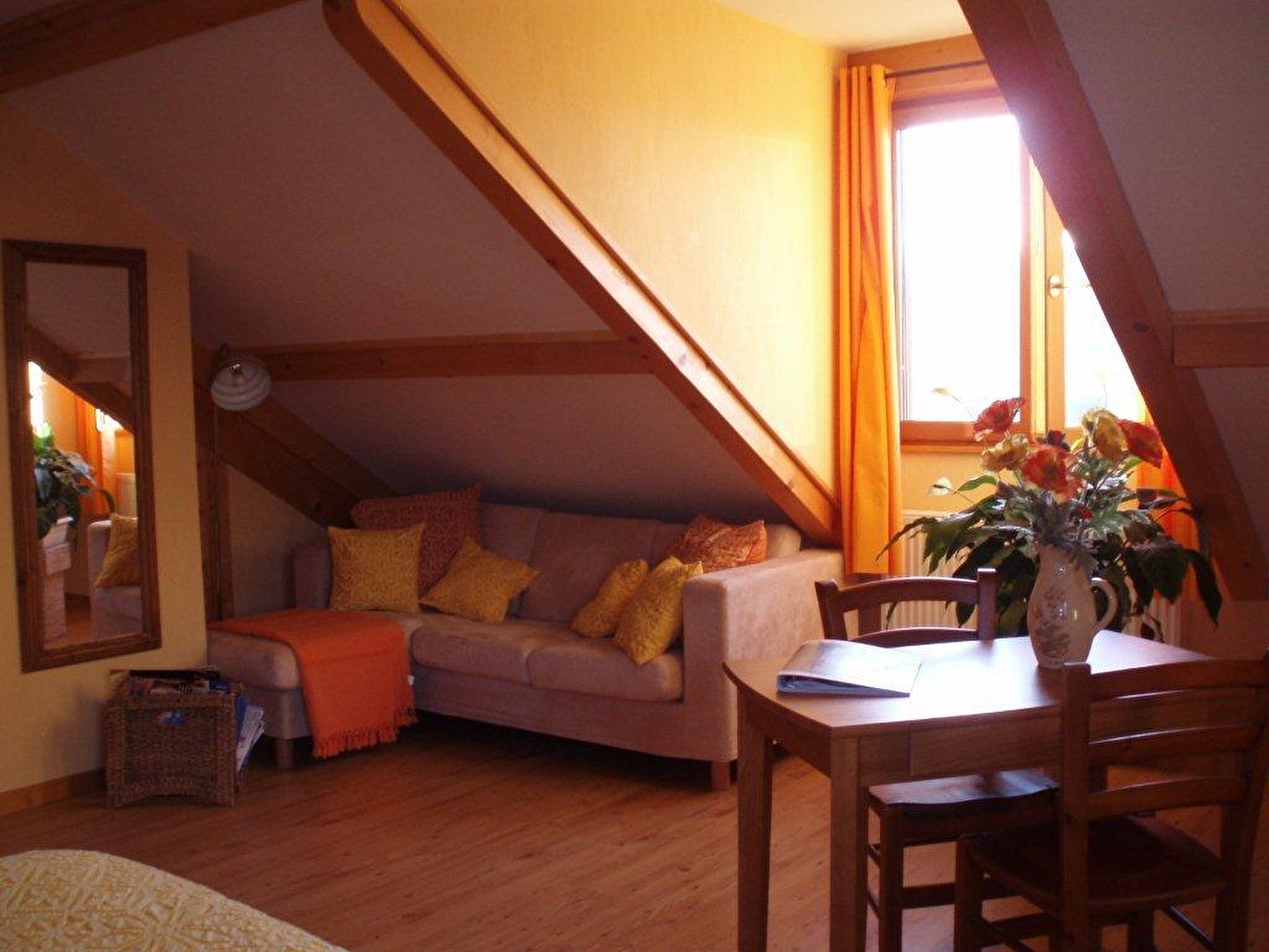 Sur les hauteurs du village, dans un cadre reposant, une chambre familiale (pour 2 ou 4 pers.), composée de deux grandes chambres (la jaune avec 1 lit 2 p, et la bleue avec 2 lits 1 pl) avec sanitaires communs est aménagée à l'étage dans une ancienne ferme entièrement rénovée. La chaleur du bois et de la décoration vous ravira. Salon avec télévision réservé aux hôtes, bibliothèque. Les petits-déjeuners vous seront servis sur la terrasse, où dans la véranda vous offrant une magnifique vue sur la campagne environnante. La source de la Saine est à 500 m.