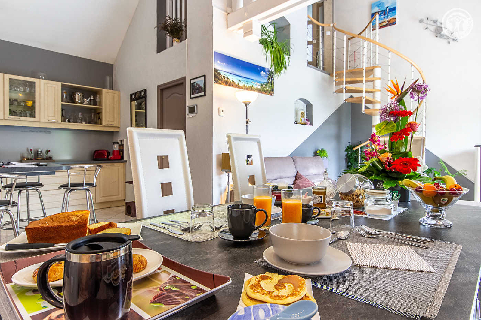 Nathalie vous accueille au sein d'une charmante villa contemporaine de style, sise au cœur d'un petit village résidentiel blotti en toute proximité de la voie verte (connectée à l'EuroVélo6) & de la Saône (véritable paradis des kayakistes & des pêcheurs, réputé pour ses célèbres silures, sandres, carpes…). En pleine campagne bressane, dans un agréable cadre champêtre & rural préservé, en lisière de champs, rivières et prairies, proche de vastes forêts domaniales (dont le Bois de Bissy situé à deux pas), au creux d'un site naturel protégé classé "Zone Natura 2000" pour son remarquable écosystème (dont une exceptionnelle réserve ornithologique riche de 160 espèces et de nombreuses variétés végétales rares). Spacieuse suite familiale de 50m² de très bon confort (totalement indépendante). Chaleureux cachet campagnard d'esprit contemporain. Ambiance coquette et douillette. Confortable & ultra spacieuse salle de bain de 9m² parfaitement équipée (dimensions rares). En bonus très privilégié, vous bénéficiez d'une « mini » terrasse privative nichée à l'abri des regards (côté entrée privative de la suite). Sur une vaste propriété close de 1500m² soigneusement aménagée (engazonnée, végétalisée & fleurie), dotée d'une double terrasse (nord-est/sud-ouest) dont une large avec salon de détente « outdoor », ainsi que d'une grande cour, véritable terrain de pétanque naturel !
