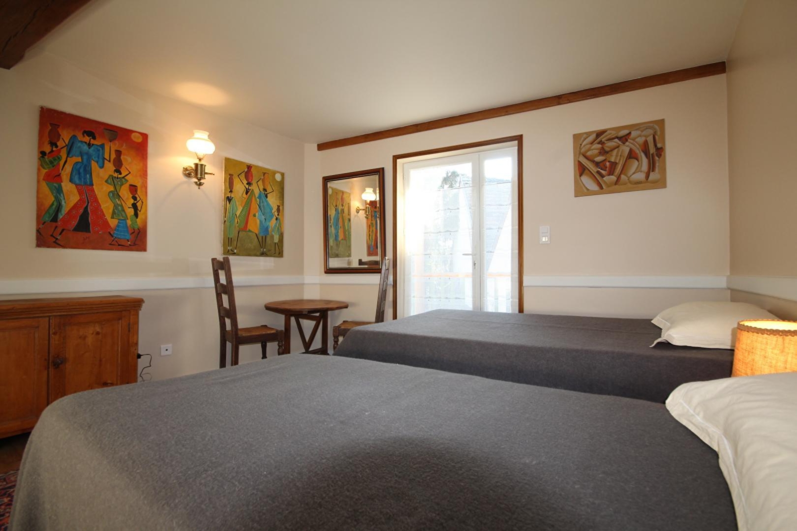 Composition : Maison de village mitoyenne jouxtant un gîte appartenant également au propriétaire (maison individuelle sur la propriété / totale indépendance). Wifi. Chauffage central gaz. Poêle bois dans pièce de vie. Chambre double au 1er étage (lit 1 p. 120x190cm + lit 1 p. 90x190cm) salle d'eau privative (douche/Wc). Petits-déjeuners servis dans le séjour du propriétaire. Balcon abrité + mini jardinet privatifs. Terrain clos. Parking privé. Local vélos. Restaurants & commodités dont supermarché à 5 km.