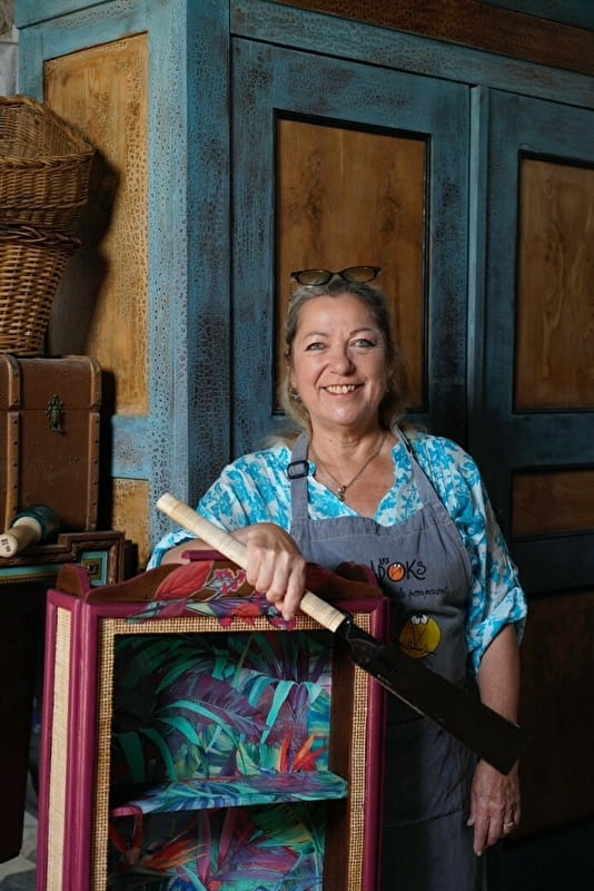 Elle développe une passion pour la transformation de mobilier, de sièges et d’objets destinés à la déchèterie auxquels elle donne un nouvel avenir et parfois un nouvel usage.