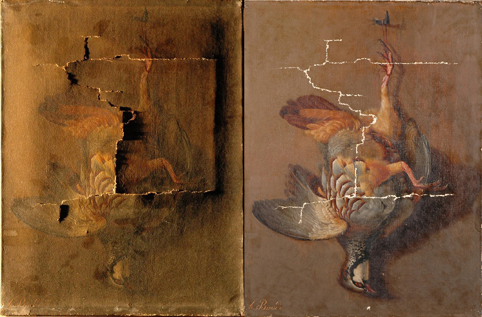 Même si votre peinture connait des dégradations importantes (incendie, dégâts des eaux, déchirures complexes), il est toujours possible de la consolider, de restaurer sa toile grâce à un rentoilage, de refixer les écailles et de restaurer son image.