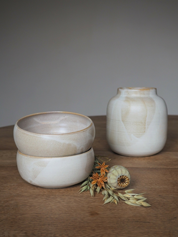 Production de céramique artisanale. Objets du quotidien et décoratifs en grès, pièces uniques ou en petite série fabriquées au tour, au colombin ou à la plaque.