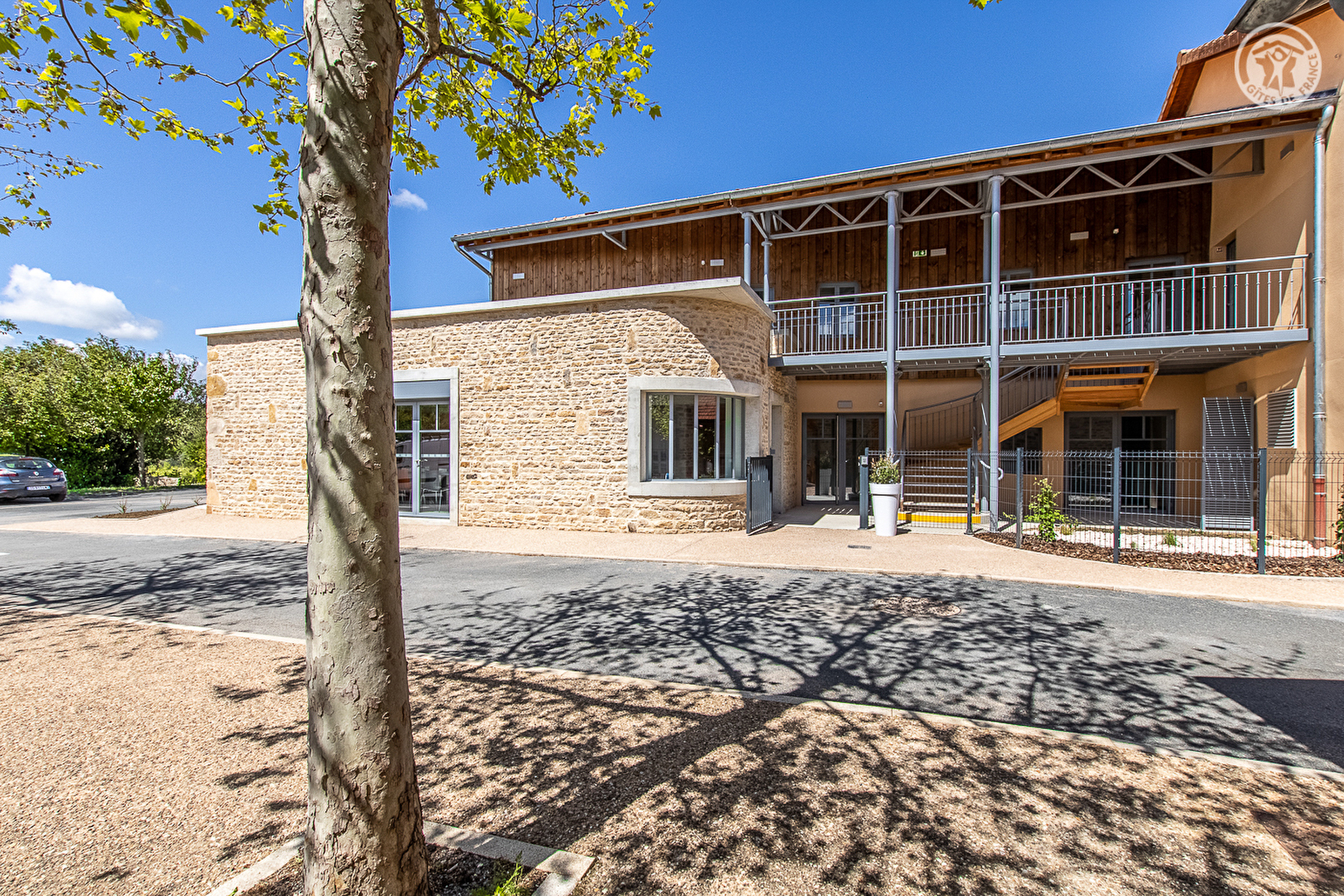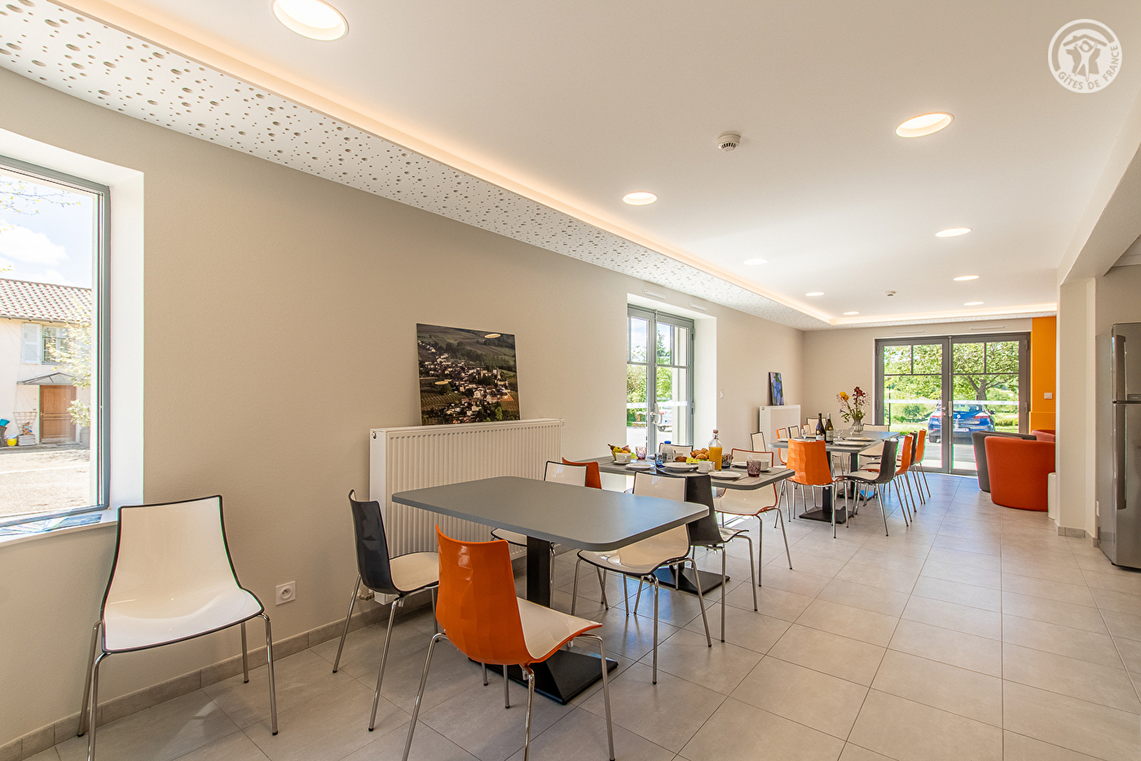Confortable gîte de groupe (appartenant à la commune) aménagé au sein d'une demeure de pays du 19ème siècle soigneusement restaurée, revisitée & sublimée avec style en très élégant bâtiment d'architecture contemporaine mixant traditions et modernité, sise au calme en pleine campagne mâconnaise, en bordure d'une paisible petite place nichée au cœur du pittoresque & charmant village de Chânes, l'une des plus petites communes de Saône-et-Loire. Blotti au creux des magnifiques vignobles de l'ultra réputé cru Saint-Véran, ce petit bourg viticole typique à l'indéniable charme, dispose d'un riche patrimoine (église romane du XIème siècle classée, belles demeures bourguignonnes historiques, maisons traditionnelles de vignerons, château du XVIIème...) et jouit d'un cadre paysagé vallonné de toute beauté, successions de vastes coteaux de vignes, bucoliques petites rivières & collines boisées. Gîte de très bon confort. Ultra spacieux & lumineux. Pièces aux dimensions nobles. Cachet contemporain soigné. Ambiance zen & douce twistée par un esprit plus « pop » et « vitaminé » côté chambre. Vaste balcon-terrasse panoramique exposé offrant une superbe vue dégagée sur le vignoble et la campagne environnante. Agréable grand jardin public végétalisé et arboré (cognassier, noyer, pommier, cerisiers du japon…) lové en lisière immédiate de vignobles, directement accessible au pied du gîte, parfaite aire de jeux pour les enfants.