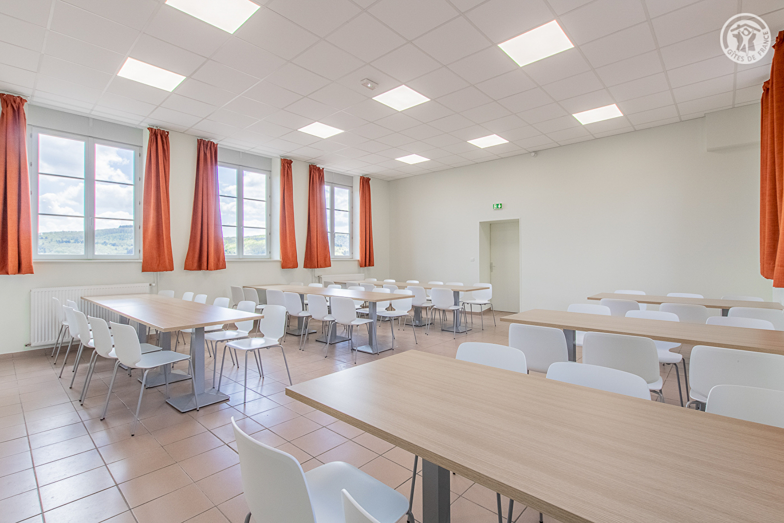 Composition : Maison individuelle sur 3 niveaux. Wifi (fibre). Chauffage central bois + cheminée. Rdc : cuisine professionnelle, séjour-salle à manger, salon, salle de réunion-séminaire (toute équipée), chambre PMR avec sde privée (douche/Wc), 2 Wc indépendants dont 1 PMR. 1er étage : salon TV/bibliothèque, 6 chambres dont 1 avec salle d'eau privée (douche/Wc), 2 salles d'eau (douches), bloc sanitaire (3 douches), 4 Wc indépendants. 2ème étage : 2 chambres dont 1 avec sde privée (douche/Wc). Au total : 4 chambres avec 3 lits 1 p. / 2 chambres avec 5 lits 1 p. / 3 chambres avec 6 lits 1 p. Tous les lits en 90x190cm. 2 chambres en accès par extérieur. Cour close (avec espace terrasse) + local vélos + abri voitures (2 places) + parking privés. Commerces 5.5 km.