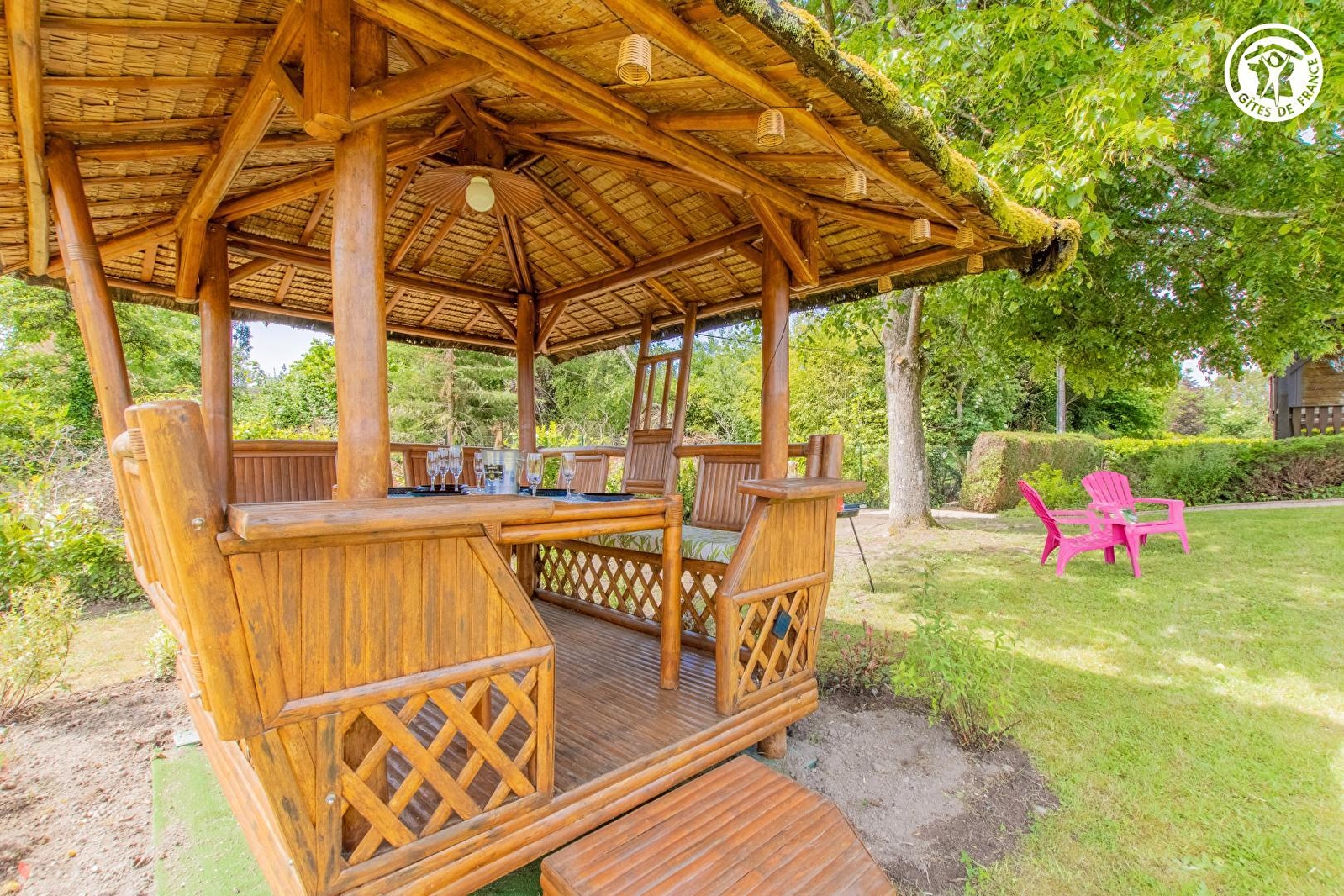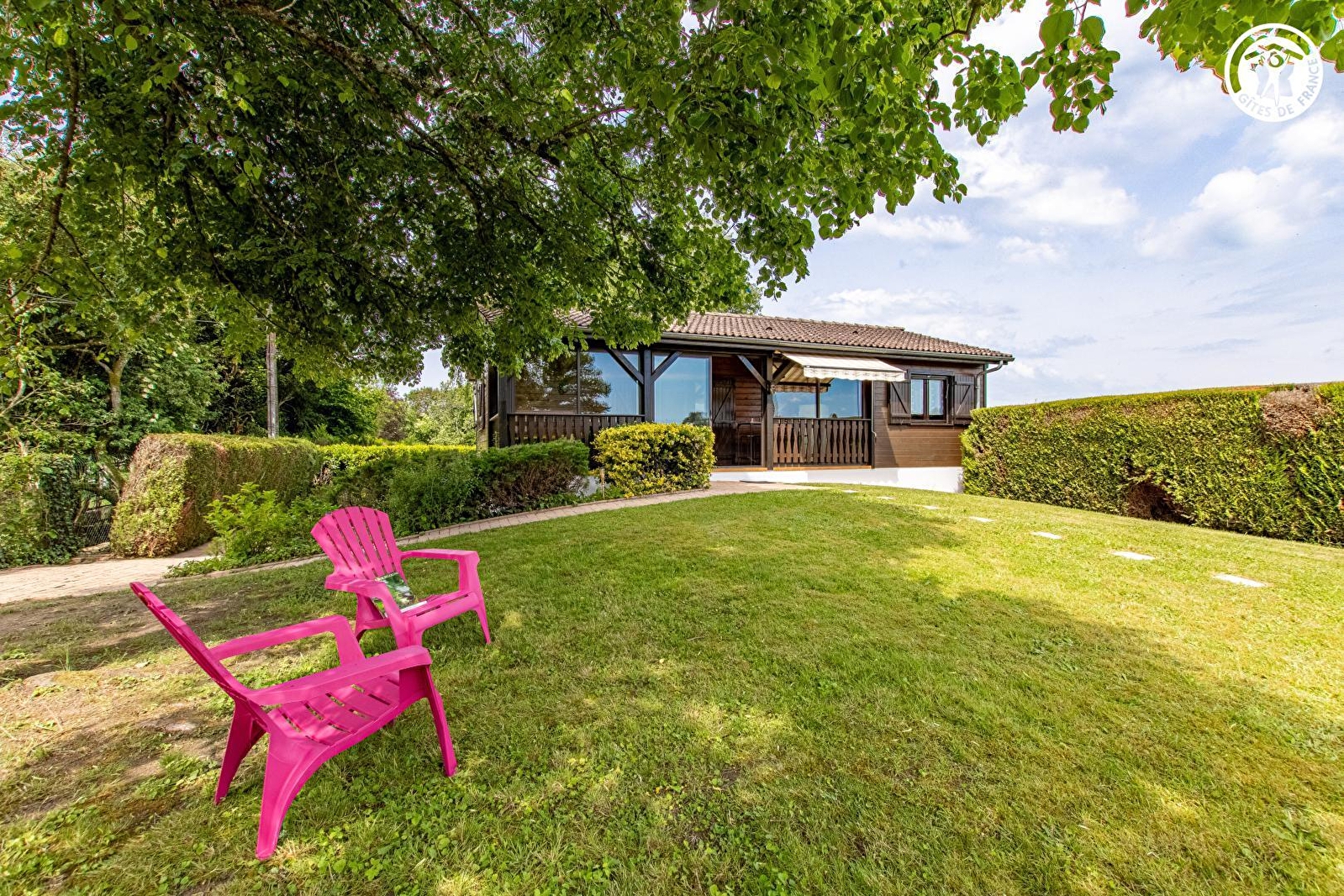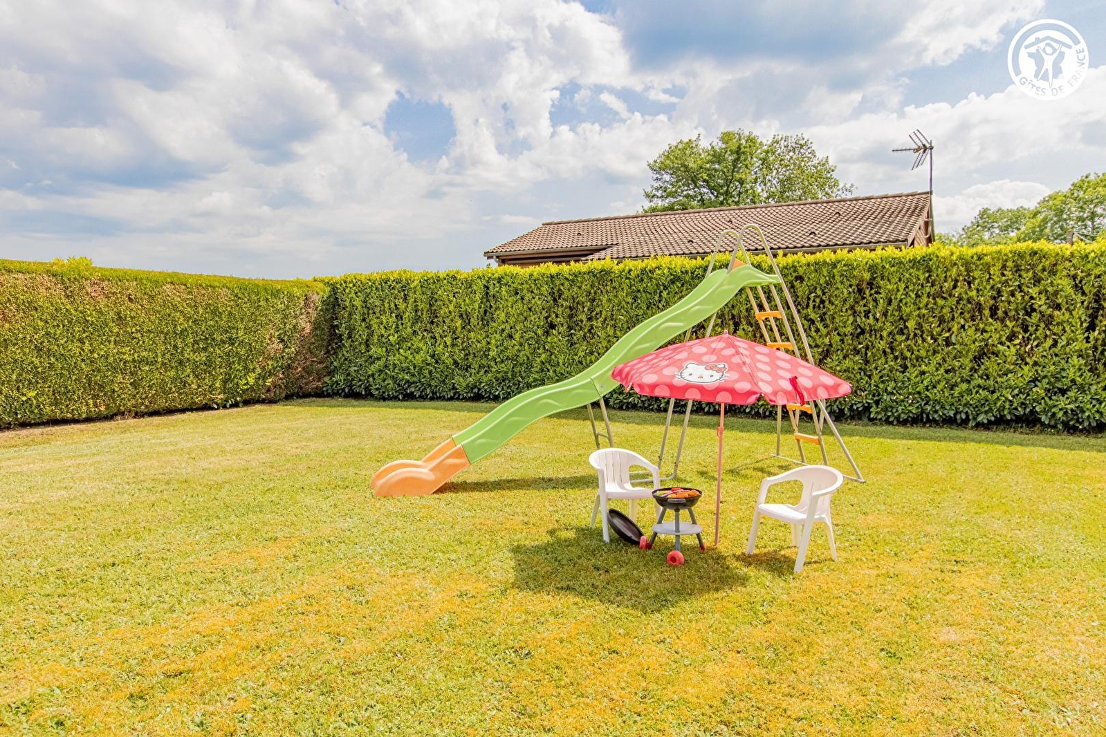 Composition : Maison individuelle (accès par 300m de chemin empierré carrossable). Gîte en rdc surélevé accessible par petit chemin montant à flanc de pelouse depuis parking. Wifi (fibre). Chauffage électrique. Séjour-cuisine-salon (lit 2 p. 140x190cm surélevé / 2 lits 1 p. gigognes 90x190cm modulables en lit 2 p. / canapé convertible 140x190cm), chambre (lit 2 p. 140x190cm), salle d'eau (douche/wc), buanderie indépendante en sous-sol accessible par l'extérieur. 1er étage : "espace jeux" en mini mezzanine très soupentée (accès par échelle de meunier). Terrasse abritée (véranda) + jardin (800m² avec toboggan) + local vélos + parking privés. Commerces & services 600m. Supermarché 2 km.