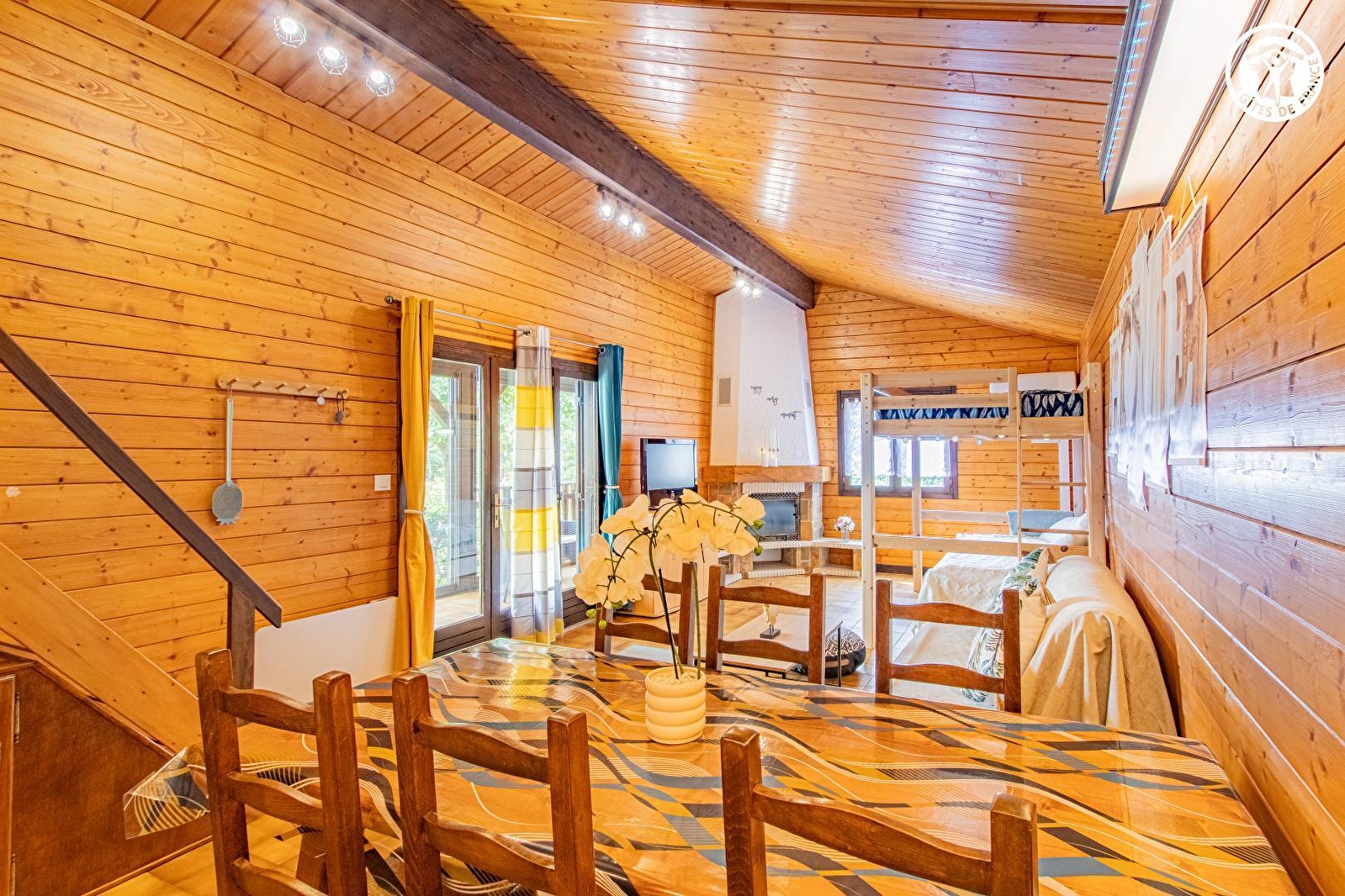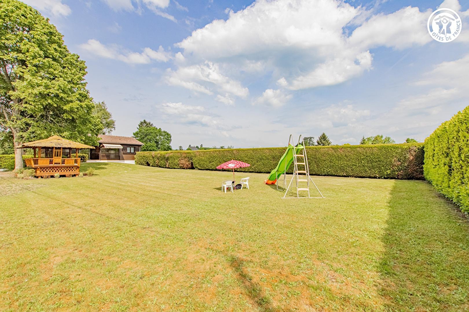 Jennifer & Romain vous accueillent au sein d'un ravissant petit chalet "eighties" - intégralement relooké avec soins - blotti au calme, en impasse au bout d'un chemin, en lisière immédiate de prairie (avec les paisibles vaches charolaises comme voisines privilégiées en saisons), au sein d'un mini hameau rural résidentiel ouvert sur les prés, niché sur les rives de l'Arroux ("biotope" réputé classé "rivière à migrateurs" accueillant de nombreuses espères rares & protégées / anguilles, truites sauvages, lamproies marines, brochets…). Totale tranquillité & relaxant cadre champêtre à deux pas du pittoresque bourg commerçant de Toulon-sur-Arroux, riche d'une église romane du XIe classée & d'un vieux pont médiéval aux treize arches daté de 1140 (nombreux petits commerces & services sur place dont supermarché à 2 km), lové en pleine campagne préservée entre bocage & forêt au creux de la verdoyante vallée de l'Arroux. Gîte de bon confort au chaleureux cachet campagnard & montagnard boisé un brin "vintage". Beau volume de la pièce de vie. Large terrasse abritée sous véranda dominant un intimiste jardin engazonné de 800m² (niché à l'abri des regards derrière des haies), où trône un agréable tilleul "ombrageant", agrémenté d'une insolite terrasse exotique ("paillote" en bambous) & d'un toboggan.