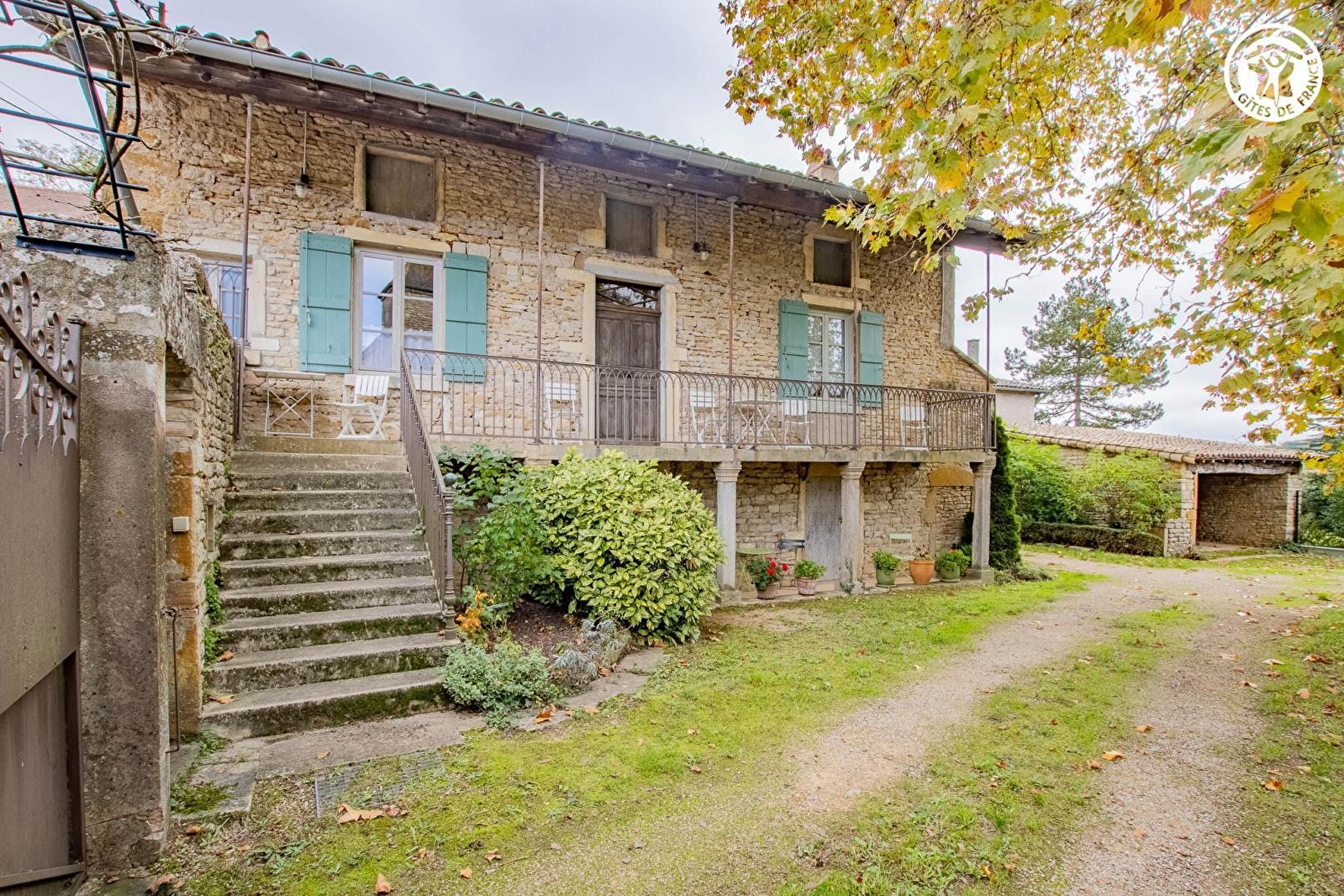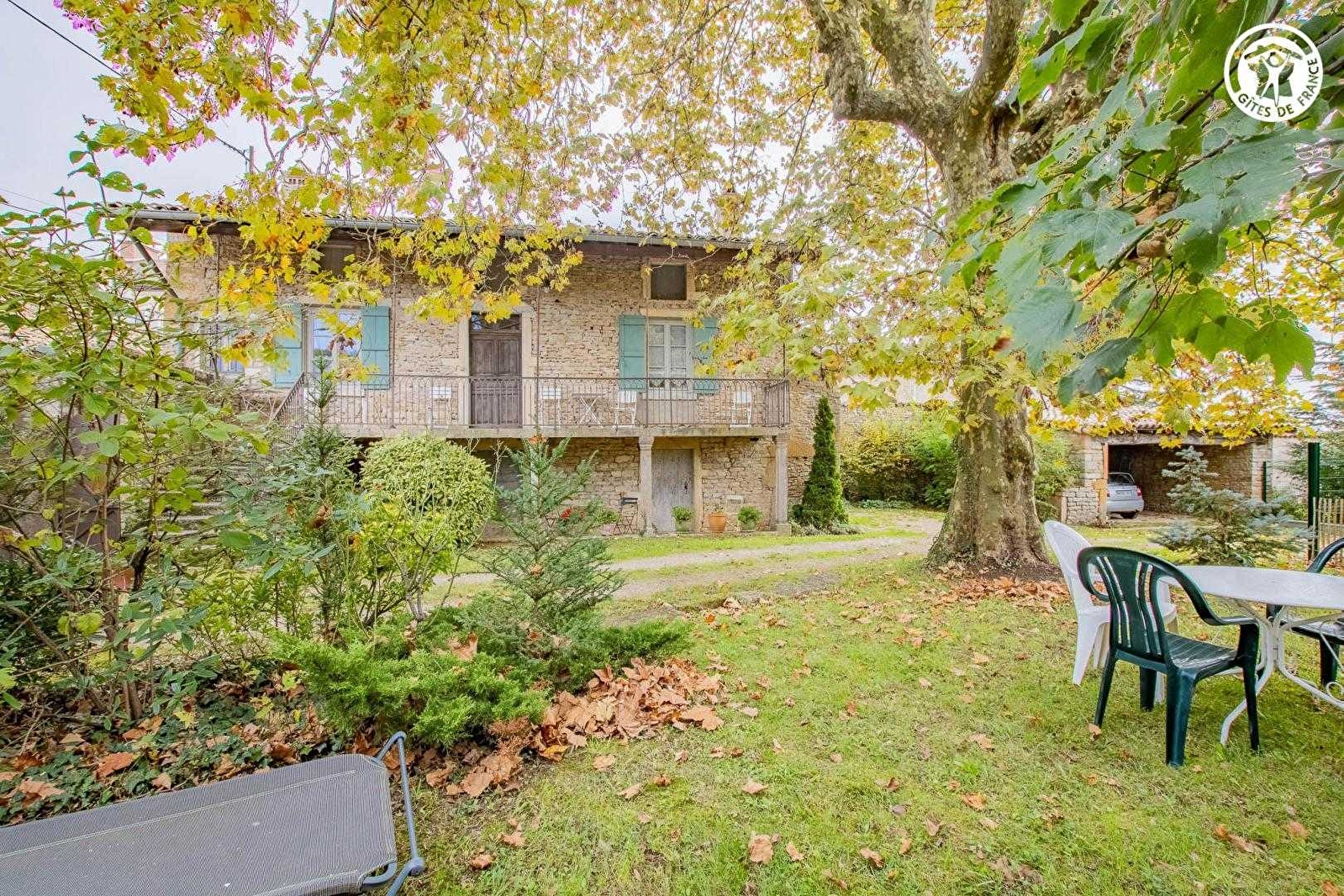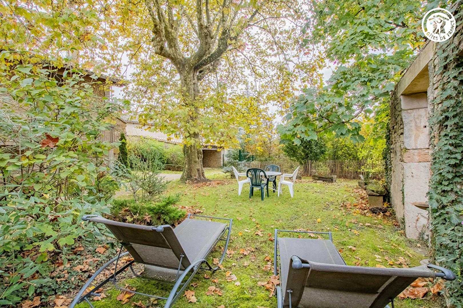 Passionnée d'histoire & de patrimoine, Josette vous ouvre les portes d'une élégante authentique demeure du XVIIIe siècle, intégralement revisitée en villégiature de charme, voisinant la superbe maison de maître datant de 1583 qu'elle occupe (elle également parfaitement restaurée), sise au calme en bordure de ruelle, à deux pas des premières vignes, au cœur d'un pittoresque & charmant petit village bourguignon typique, chargé de grande histoire & parfaitement sauvegardé (belle église néo-romane du XIXe, lavoirs & nombreuses "cadoles" réhabilitées avec soins). Totale tranquillité en pleine campagne viticole préservée du haut mâconnais, tout à la fois citadine & rurale, lové au creux d'un vallon de vignobles & prairies que dominent les crêtes boisées des vastes forêts sauvages environnantes, au sein d'un espace protégé en ZNIEFF pour ses richesses floristiques & faunistiques. Spacieux gîte de très bon confort. Grandes pièces & beaux volumes. Chaleureux cachet campagnard sublimé par l'âme dépaysante, un brin "rétro", d'une ancienne demeure cossue comme par une restauration patrimoniale soignée (exceptionnels sols en carreaux de ciment, portes moulurées, poutres dont une "datée", manteaux de cheminée en marbre, évier en pierre, tommettes… d'origine). Énormément de charme & de caractère. Intimiste jardin clos (500m² avec sa cour) blotti derrière d'historiques murs en pierres, doté d'un salon de jardin agréablement ombragé sous un platane "plus que centenaire". Large "galerie mâconnaise" traditionnelle (balcon abrité).