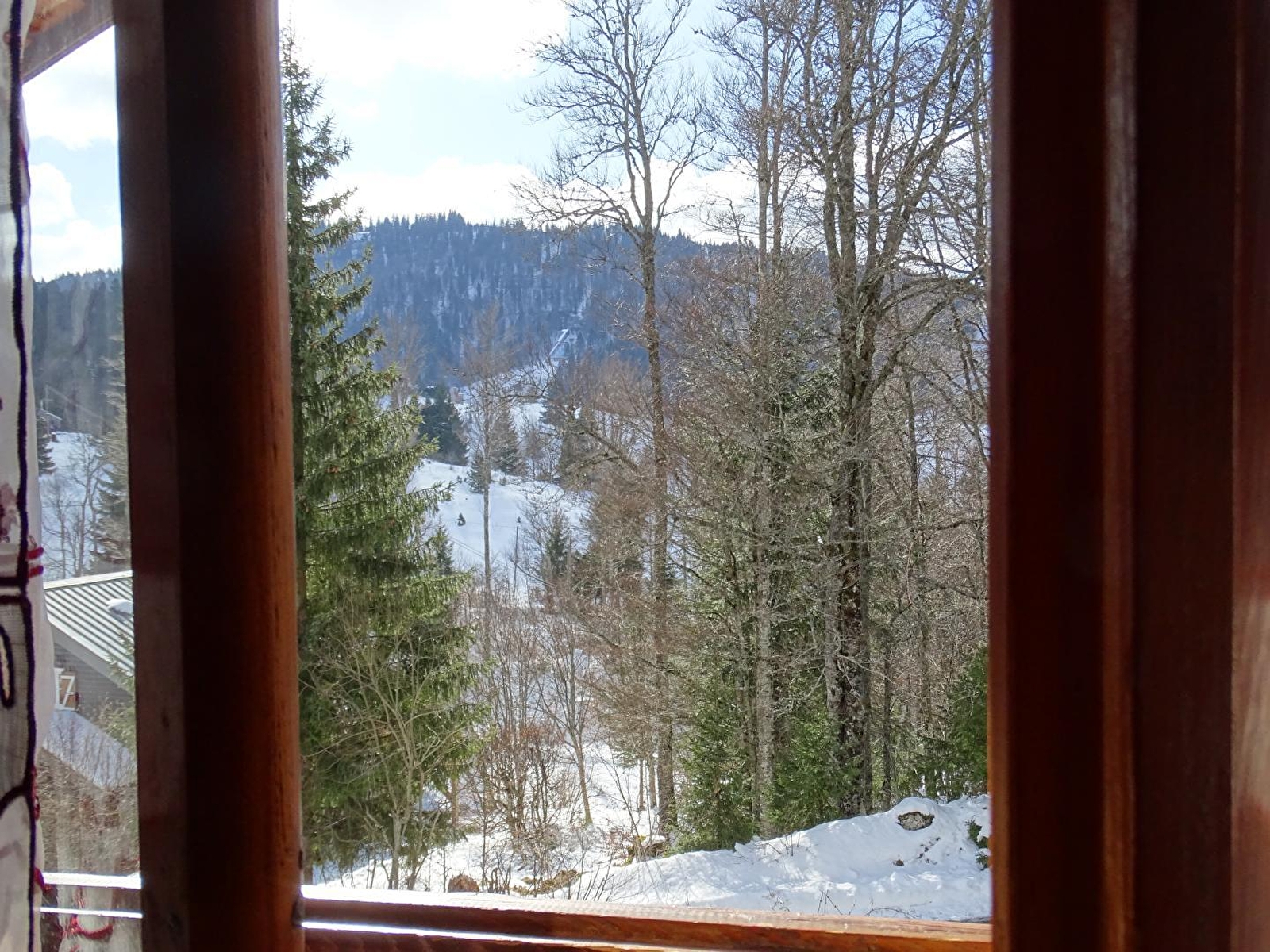 Logement au 2ème étage d'un chalet où se trouvent 2 autres gîtes. Salon-séjour-cuisine, petite salle d'eau, wc indépendants, ch1: 1 lit 2 pl, 1 lit 1 pl, canapé convertible, sèche-linge, terrain attenant commun aux 3 gîtes non clos, cour, salon de jardin, barbecue, local pour vélos et skis, parking privé. Chauffage géothermique. Toutes charges comprises. réfrigérateur avec compartiment congélateur. Lit bébé sur demande.
