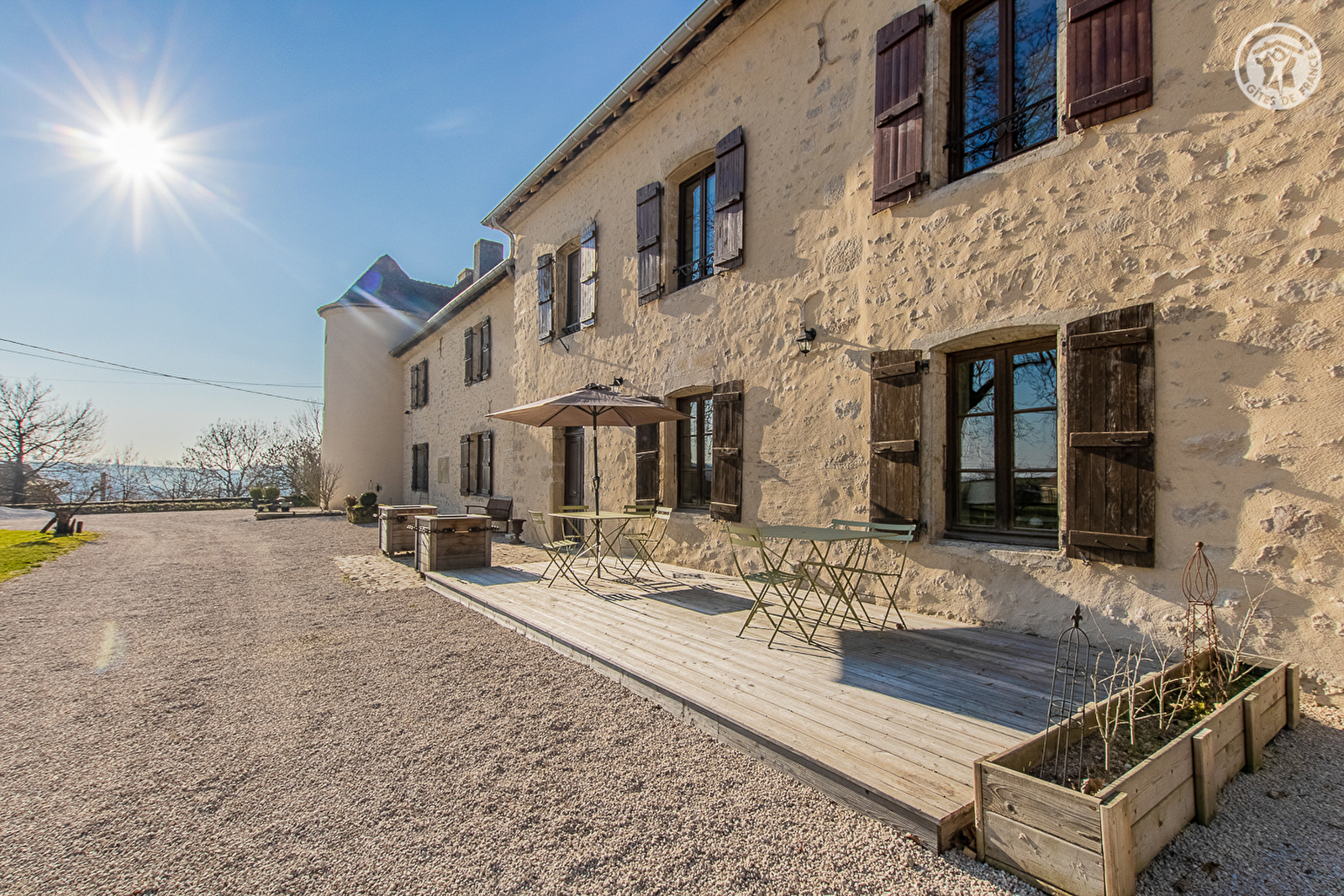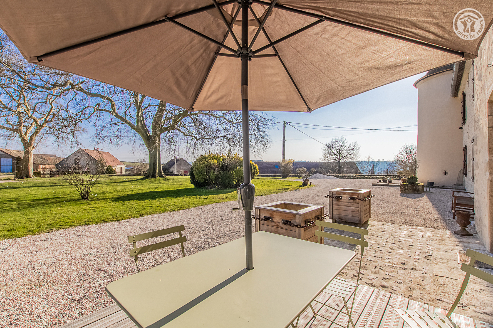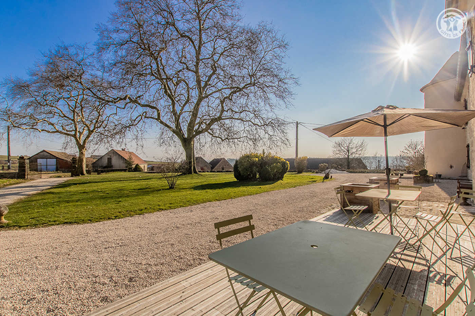 Alain-Philippe vous ouvre les portes d'un authentique château de 1650, élégant édifice de caractère pétri d'histoire restauré dans les règles de l'art, sis au calme au cœur d'un petit hameau rural blotti sur un plateau exposé dominant la campagne environnante. Magnifique écrin champêtre vallonné de collines boisées, lové au cœur du bocage charolais, entre douces prairies & belles forêts sauvages. A deux pas de la cité médiévale du Mont-St-Vincent (église romane du XIIe, remparts, tour de l'Assommoir, ruelles, anciennes maisons, musée archéologique...) lovée sur les flancs du mont éponyme, belvédère unique offrant un somptueux panorama à 360° sur 14 départements, du Mt-Blanc au Puy de Dôme. Propriété soignée aménagée dans l'esprit d'une « micro-ferme » (poulailler, cages à lapins, chevaux & poneys parqués sur place), offrant un ravissant parc engazonné aux arbres centenaires (avec terrasse privative), un terrain de pétanque, une terrasse couverte avec cuisine d'été et un vaste préau abritant un espace ludique pour les enfants (ping-pong, punchingball et multiples équipements de loisirs & jeux). Spacieux gîte de grand confort. Chaleureux cachet « bourgeois » cossu et raffiné (meubles & accessoires déco de style), sublimé par une restauration patrimoniale très soignée (majestueux escalier en pierre, murs en pierres & briques, linteaux en pierres, verrière en bois d'origine…). Beaucoup de charme & caractère. Ambiance douce & dépaysante d'une demeure chargée d'histoire.