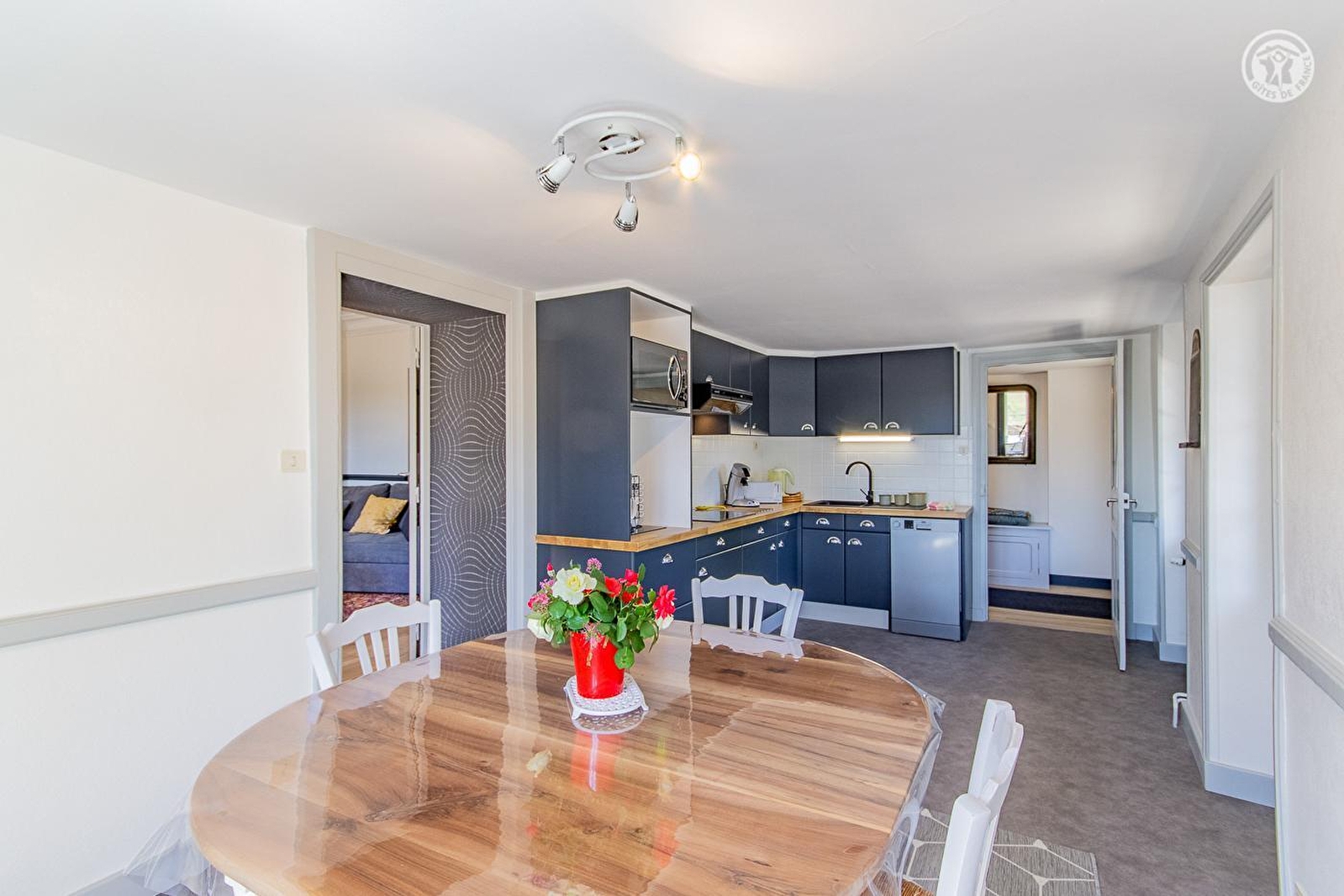 Composition : Maison de village mitoyenne comprenant également le logement des propriétaires (indépendance totale sans vis-à-vis). Chauffage central gaz. Wifi (fibre). Gîte au 1er étage (accès par escalier extérieur). Séjour-cuisine, salon (1 canapé convertible 1 p. 130x190cm en appoint en « alcôve »), 2 chambres (lit 2 p. 160x200cm / lit 2 p. 140x190cm), salle d'eau (douche), Wc indépendant. Balcon-terrasse + balcon abrité privatifs. Local vélos. Parking public gratuit. Toutes commodités 5 km. A noter : hauteur sous plafond comprises entre 2.04 et 2.08m (sauf salon).