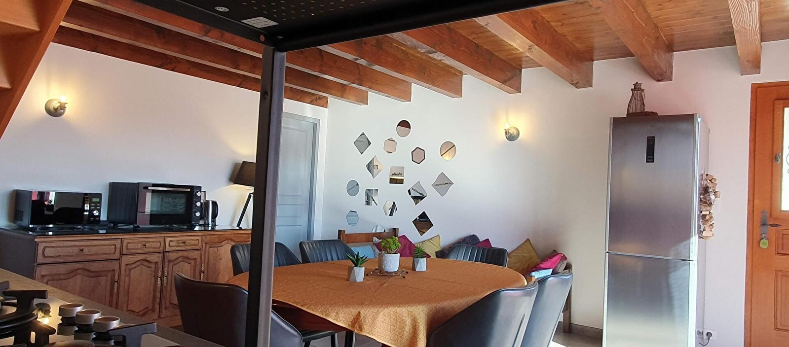 Le gîte "LA LOGE" vous accueille au cœur d'un domaine équestre de 9 hectares, dans un cadre naturel exceptionnel et où les animaux de la ferme (chevaux, poneys, chèvres, lamas...) évoluent en toute quiétude et pour le bonheur des amoureux de la nature. Aménagée avec goût et spacieuse, vous profiterez d'un réel confort grâce aux installations mises à votre disposition. Au RDC vous trouverez une pièce de vie avec cuisine équipée et accès sur une petite terrasse, une 1ère chambre avec un lit de 160 ainsi qu'une salle d'eau avec douche à l'italienne et WC. A l'étage se trouvent deux pièces en enfilade : un salon avec TV, canapé convertible et un lit de 90, puis une 2ème chambre qui est climatisée et avec un lit de 140. Notre gîte se situe entre monts et vallées, ce qui vous offre le loisir découvrir des sites nommés “plus beaux villages de France” (Château-Chalon, Baume-les-Messieurs), des villages pittoresques ( Poligny ville du Comté ; Arbois – son musée et ses vins ; Salins-les-Bains – ses thermes et fortifications ; Dole – la Venise Jurassienne ; Arc-et-Senans et ses salines classées au Patrimoine Mondial de l'UNESCO...), la région des lacs (Chalain...) et des cascades (du Hérisson, des Tufs...) Possibilité de pratiquer diverses activités : randonnée à pieds, vélo, VTT... (départ depuis le gîte sur des pistes IGN), balades à poneys (activités proposées au sein de notre domaine dans le cadre de notre activité de "Ferme Équestre Élevage Juan"), piscine et thermes, lacs, visite de sites touristiques et culturels... ou tout simplement profiter de notre domaine pour vous reposer sur le temps d'un week-end ou durant quelques jours de vacances Animal de compagnie acceptés gratuitement et dans le respect de la charte d'accueil des animaux de Gîte de France (un par logement – accueil sup avec accord des propriétaires). Une caution de 300 € par animal vous sera demandée. Pour charge de véhicule électrique un surcout sera demandé (voir avec la propriétaire)