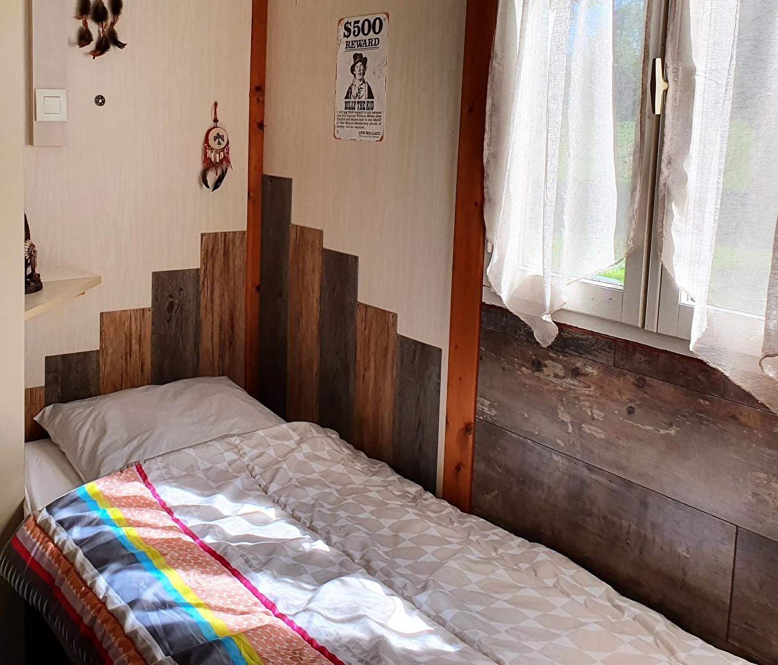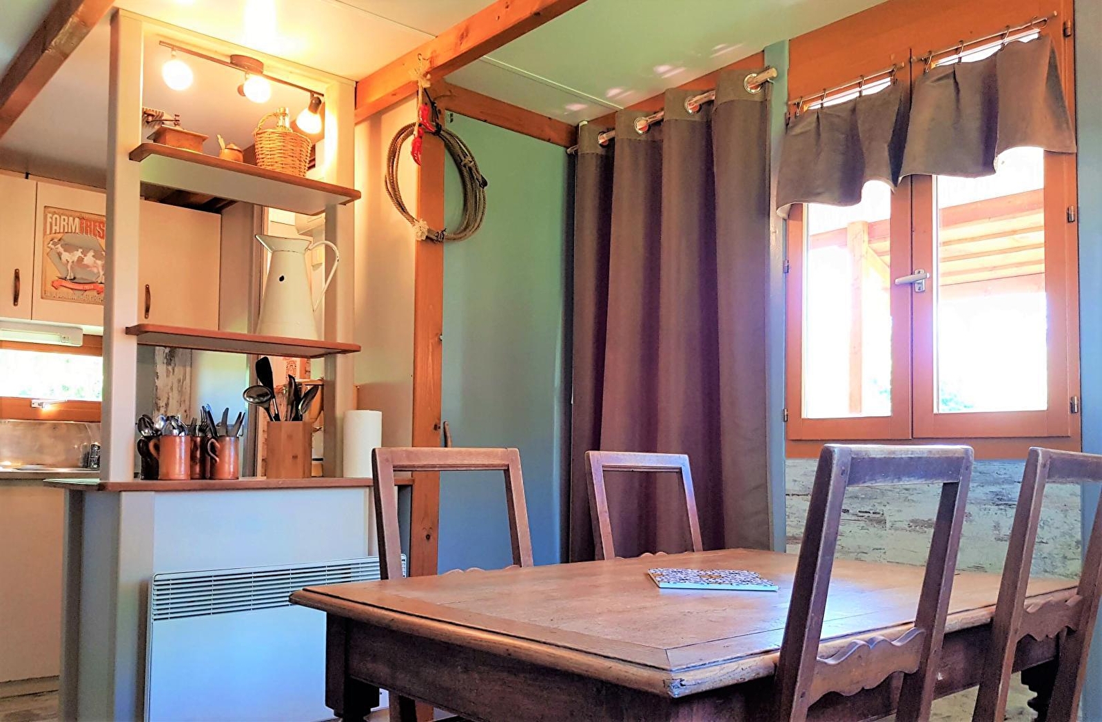 Situé au cœur d'un domaine équestre* de 12 hectares et dans un cadre naturel exceptionnel, ces hébergements type chalets vous accueillent dans un décor “western” insolite. A proximité évoluent les animaux de la ferme (chevaux, poneys, chèvres, lamas...), en toute quiétude et pour le bonheur des amoureux de la nature. Chaque chalet est composé d'une pièce à vivre avec kitchenette (plaque deux gaz, frigo table top, four micro onde, cafetière filtre, bouilloire et vaisselle nécessaire) et espace repas, une salle d'eau/wc, une 1ère chambre avec 1 lit de 140 et une 2ème chambre avec 3 lits de 80 dont 2 superposés (surface habitable : 21.70 m²), ainsi qu'une terrasse de 8.40 m². Au cours de votre séjour, vous aurez la possibilité de pratiquer diverses activités : randonnée à pieds, vélo, VTT... (départ depuis le gîte sur des pistes IGN), balades à poneys (activités proposées au sein de notre domaine dans le cadre de notre activité de "Ferme Équestre Élevage Juan"), piscine et thermes, lacs, visite de sites touristiques et culturels... ou tout simplement profiter de notre domaine pour vous reposer sur le temps d'un week-end ou durant quelques jours de vacances Notre domaine se situe entre monts et vallées, ce qui vous offre le loisir découvrir des sites nommés plus beaux villages de France (Château-Chalon, Baume-les-Messieurs), des villages pittoresques ( Poligny ville du Comté ; Arbois – son musée et ses vins ; Salins-les-Bains – ses thermes et fortifications ; Dole – la Venise Jurassienne ; Arc-et-Senans et ses salines classées au Patrimoine Mondial de l'UNESCO...), la région des lacs (Chalain...) et des cascades (du Hérisson, des Tufs...) Animal de compagnie acceptés gratuitement et dans le respect de la charte d'accueil des animaux de "Gîte de France" (un par logement – possibilité d'accueil supplémentaire avec accord des propriétaires). Caution de 300 € par animal demandée. Pour charge de véhicule électrique un surcout sera demandé (voir avec la propriétaire)