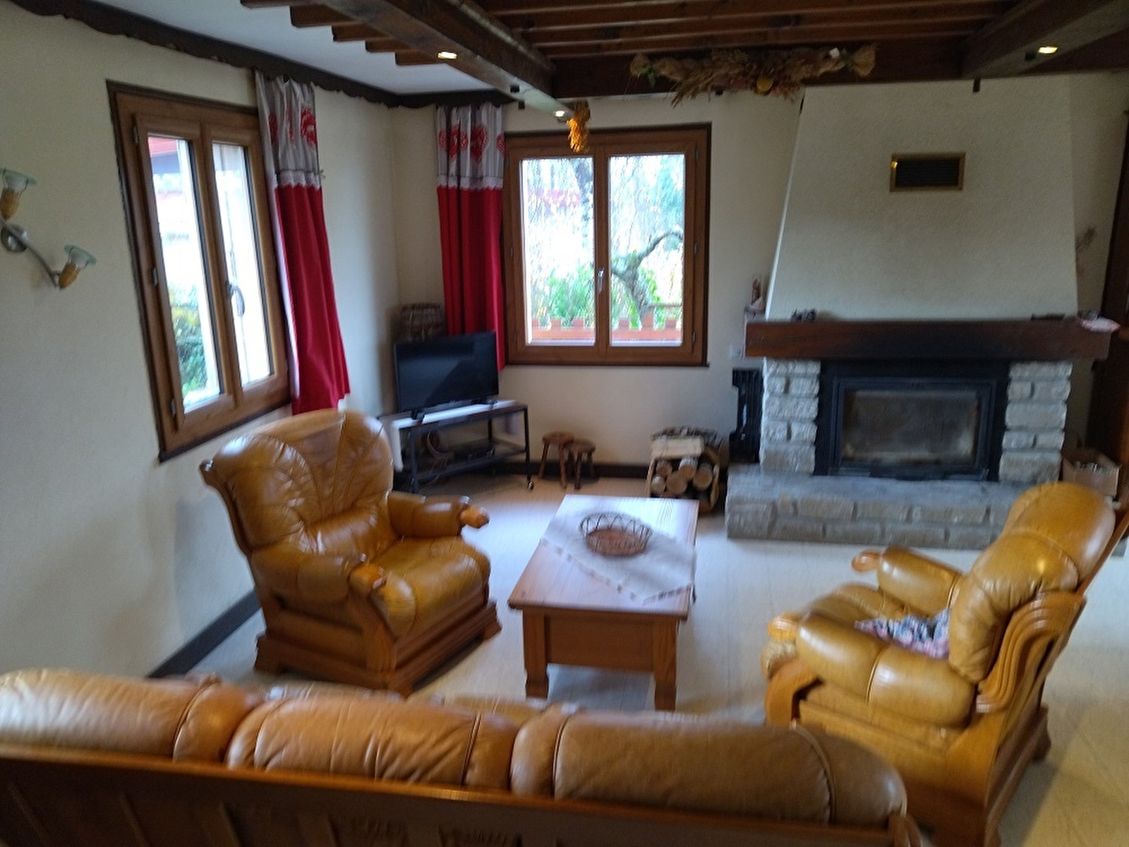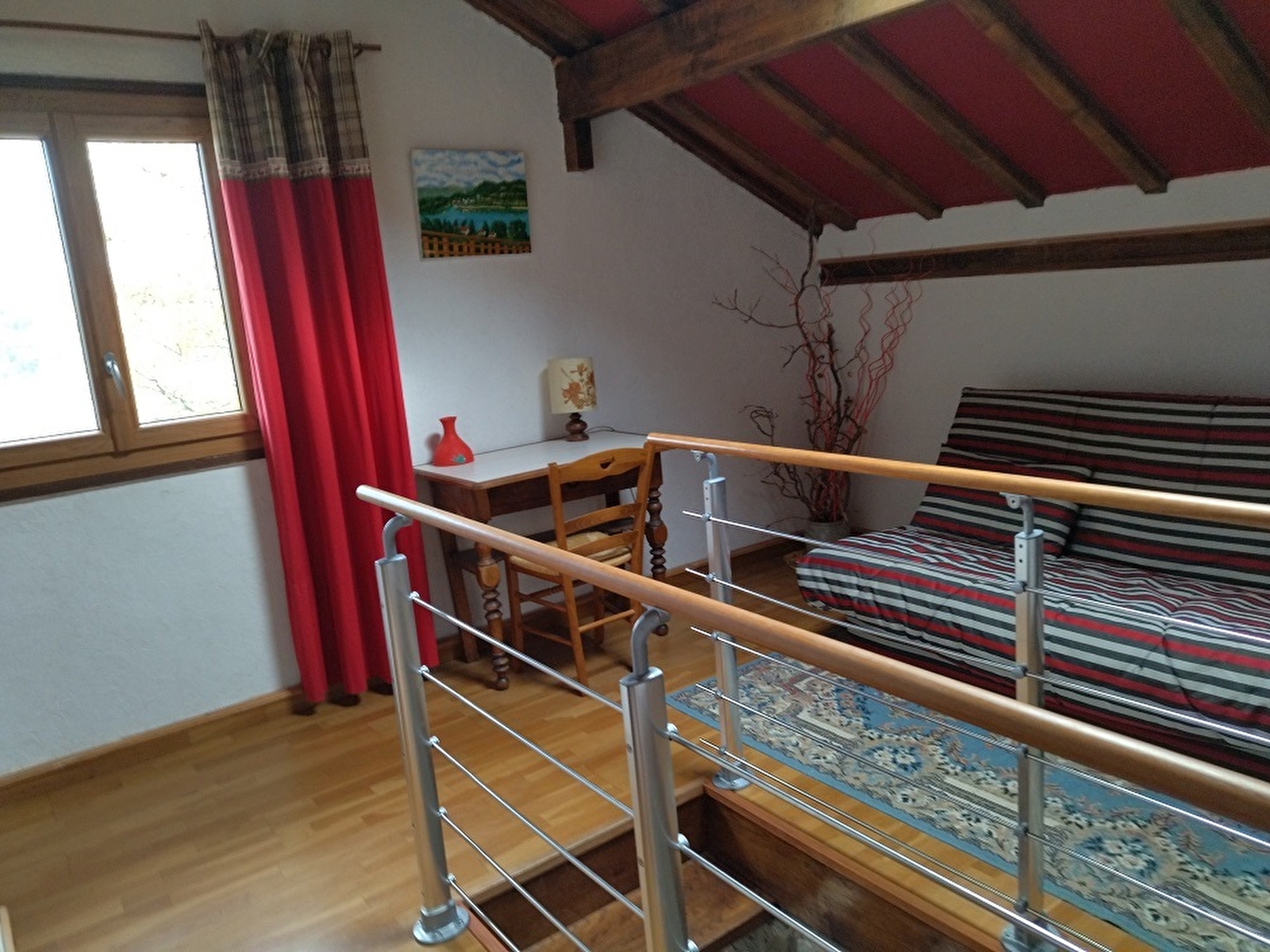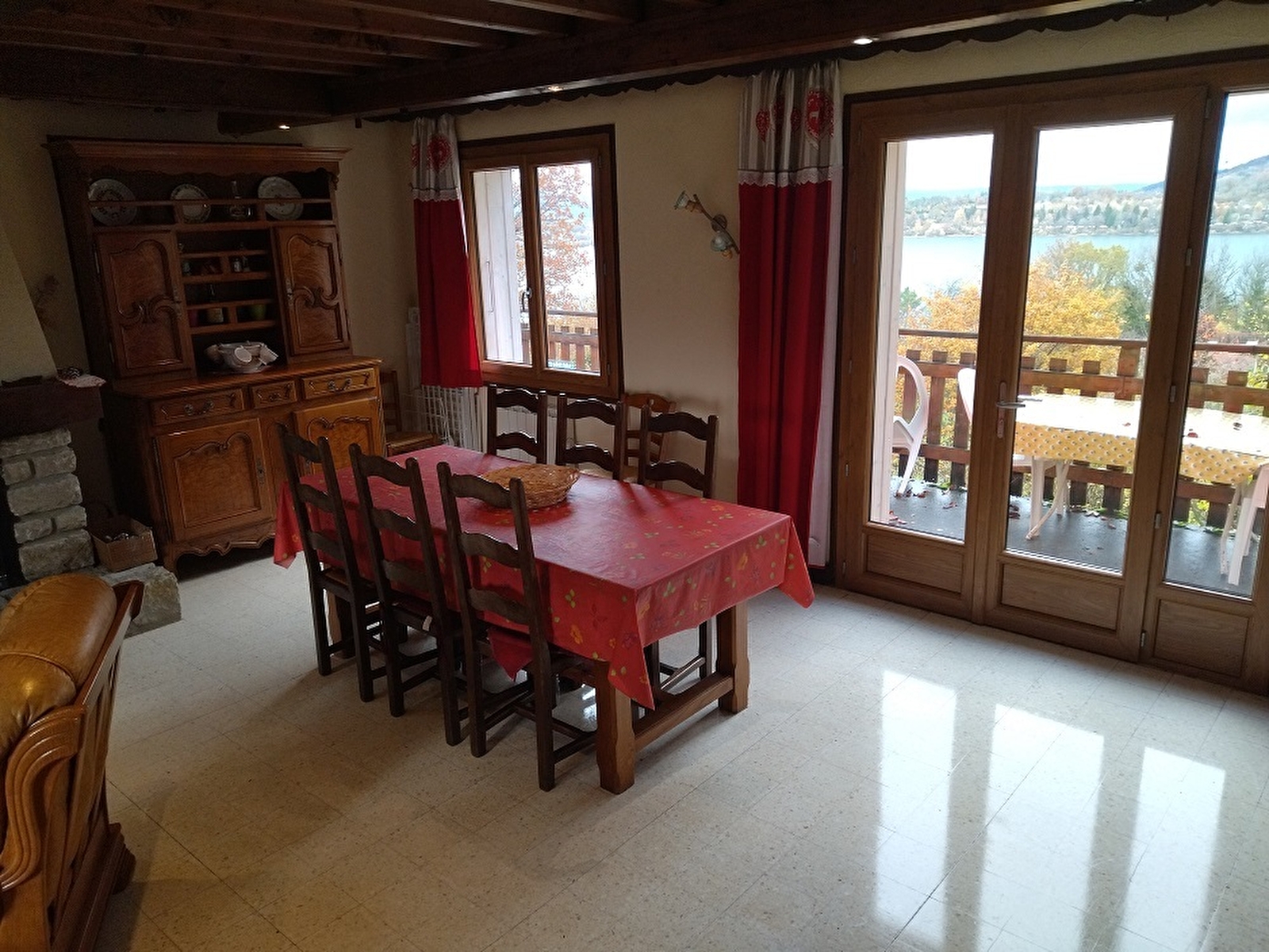 Maison indépendante de type chalet au bord du lac de Chalain. Au rez de chaussée, grande pièce à vivre composée d'un salon avec TV, cheminée, salle à manger et cuisine équipée, une salle d'eau avec douche et un wc. A l'étage : mezzanine avec canapé convertible 2 personnes, salle de bain avec baignoire, CH1 : 2 lits 1 pl superposés, CH2 : 1 lit 2 pl 160cm, CH3: 1 lit 2 pl 160cm (divisible en 2 lits de 80cm sur demande) et un wc indépendants. Terrain attenant clos avec salon de jardin et barbecue en été, cour et grand balcon offrant une magnifique vue sur le Lac. Garage privatif fermé. Électricité : 15 kw/jour offert.