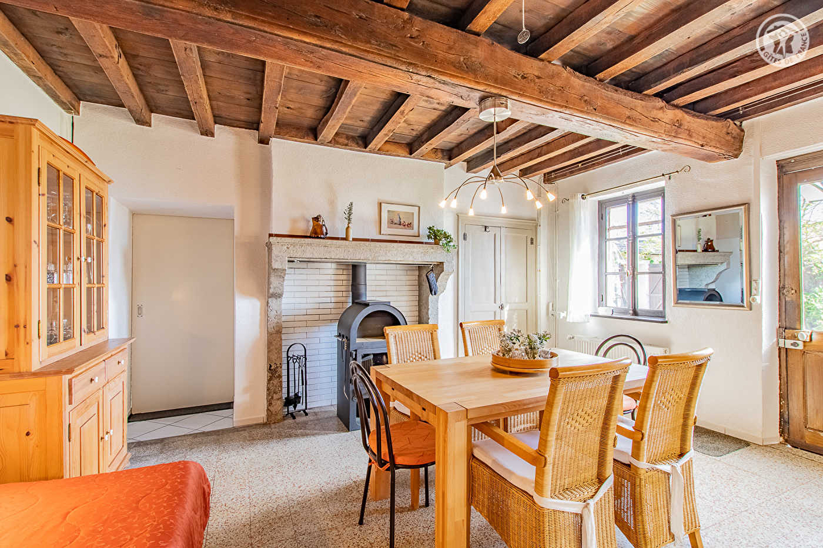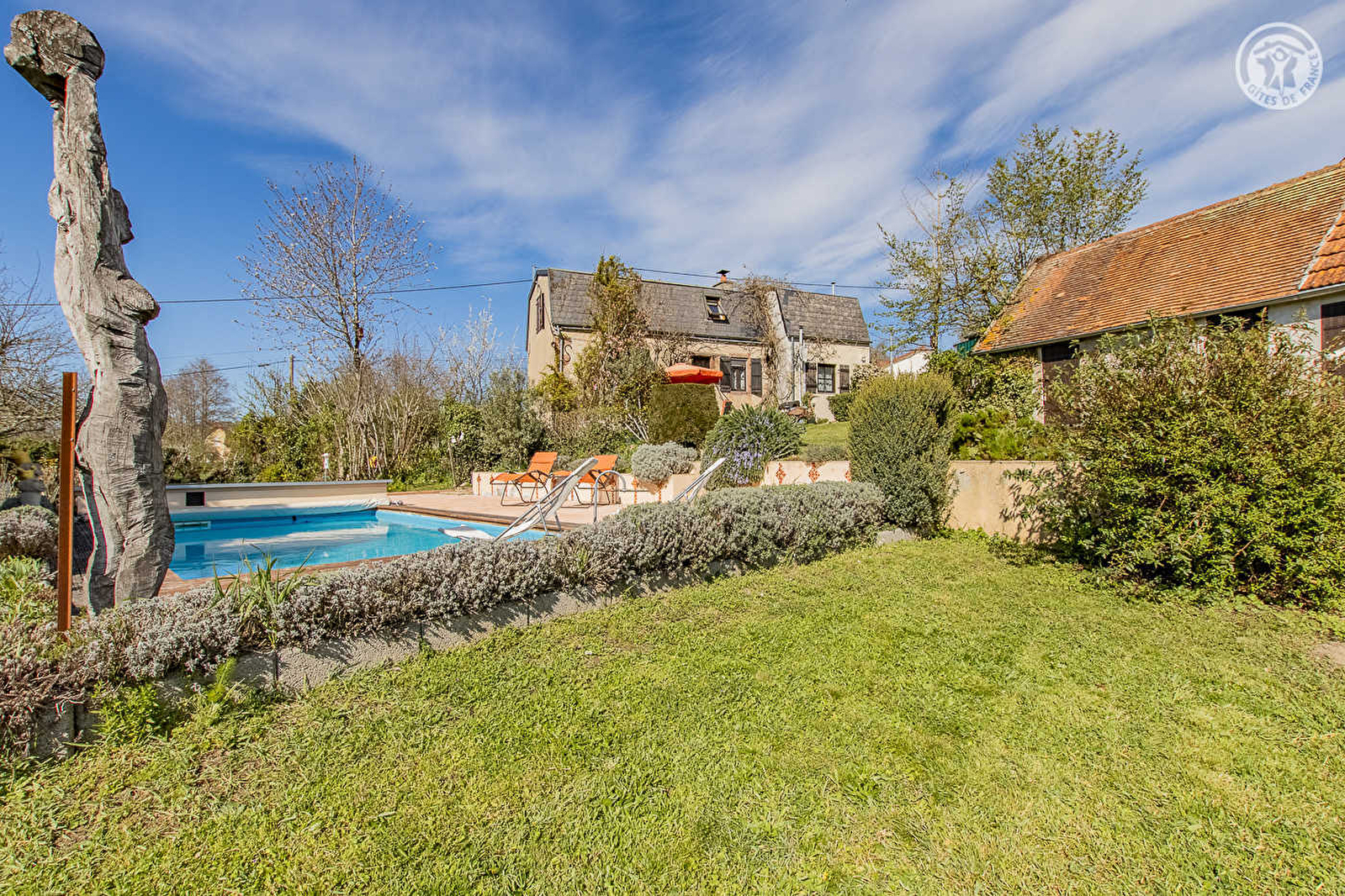 Charmante atypique demeure de pays des "années 30", intégralement revisitée en douce villégiature, adossée en "balcon" et littéral "belvédère panoramique" à flanc de colline, sur un coteau sud exposé, en lisière d'une bucolique prairie accueillant les paisibles vaches charolaises en saison. Totale tranquillité en pleine campagne vallonnée, au sein d'un petit hameau rural lové au creux d'un ravissant cadre champêtre préservé de bocage, à deux pas d'un vaste massif forestier préservé (à découvrir lors de balades à pied ou VTT), dominant les toutes proches rives de la Loire, le "dernier fleuve sauvage" d'Europe, site naturel protégé en "Zone Natura 2000" pour la qualité de son exceptionnel biotope végétal & animal (poissons, mammifères, oiseaux, amphibiens…), axe de migration, reproduction et nidification pour de nombreuses espèces dont certaines très rares (Saumon atlantique, grande Alose, Lamproie marine ou Anguille ; Échassiers, Martin pêcheur, Hirondelle de rivage, Guêpier d'Europe…). Spacieux gîte de bon confort. Chaleureux & dépaysant cachet campagnard un brin "vintage". Équipement complet de qualité. Très agréable propriété soignée, engazonnée, végétalisée & très fleurie de 3500m², parsemée de divers insolites sculptures, comprenant une piscine (8x4m), un verger fruitier (pommiers, mirabelliers, poiriers, citronniers, pied de vignes avec raisin etc… / cueillette possible) et un ludique "jardin aromatique". Somptueuse vue panoramique sur la vallée de la Loire et les monts du Raonnais en toile de fond. Magnifique site & paysages.