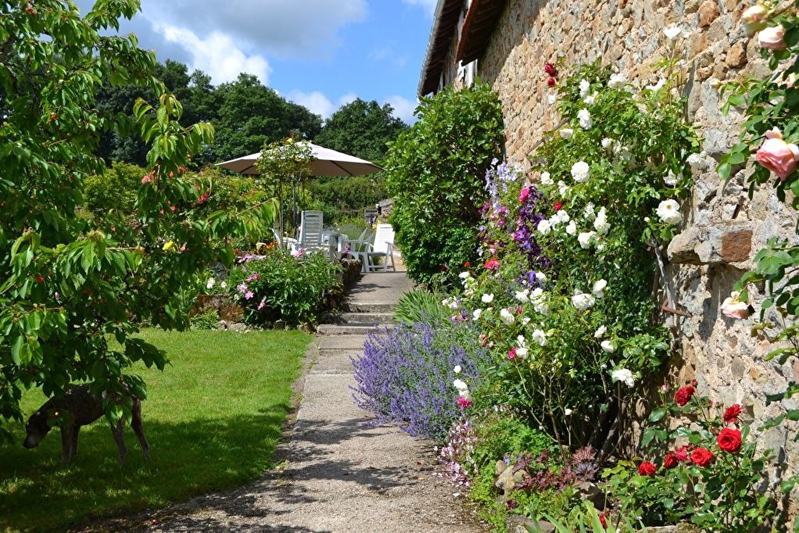 Jeanine & Gabriel (passionné de nature & paysagisme) vous ouvrent les portes de charmantes authentiques écuries de caractère datant de 1819 soigneusement restaurées (dépendances jadis de l'ancien domaine agricole charolais qui occupait les lieux, ayant joué un rôle majeur pour la résistance locale durant la seconde guerre mondiale) blotties au calme au cœur d'un paisible petit hameau rural chargé d'histoire perché en "belvédère" sur une colline dominant Montceau (situé sur la ligne de démarcation). Apaisant écrin champêtre alentour, niché en lisière d'une bucolique pâture boisée accueillant des vaches charolaises en saisons (& "Robert" leur âne parqué un peu plus loin). Possibilité de pouvoir observer la faune sauvage sur place (chevreuils, lièvres, renards, nombreux oiseaux…). Spacieux gîte de bon confort. Chaleureux cachet campagnard au charme "vintage" un brin "rustique" sublimé par l'âme du bâti d'origine (murs & piliers en pierres, poutres & charpente d'origine). Ambiance douillette. Vaste terrasse exposée ouverte sur un exceptionnel & sublime "jardin naturel campagnard paysagé d'inspiration anglaise" extrêmement fleuri de 3000m² à cheminement & enfilade, 100% écologique, soigneusement végétalisé & arboré, pensé & créé de toutes pièces par Gabriel (250 rosiers de variétés diverses, pivoines, iris, pavots, lupins, lavande fleurs des champs, très nombreux arbustes...). Superbe vue dégagée sur la campagne environnante.