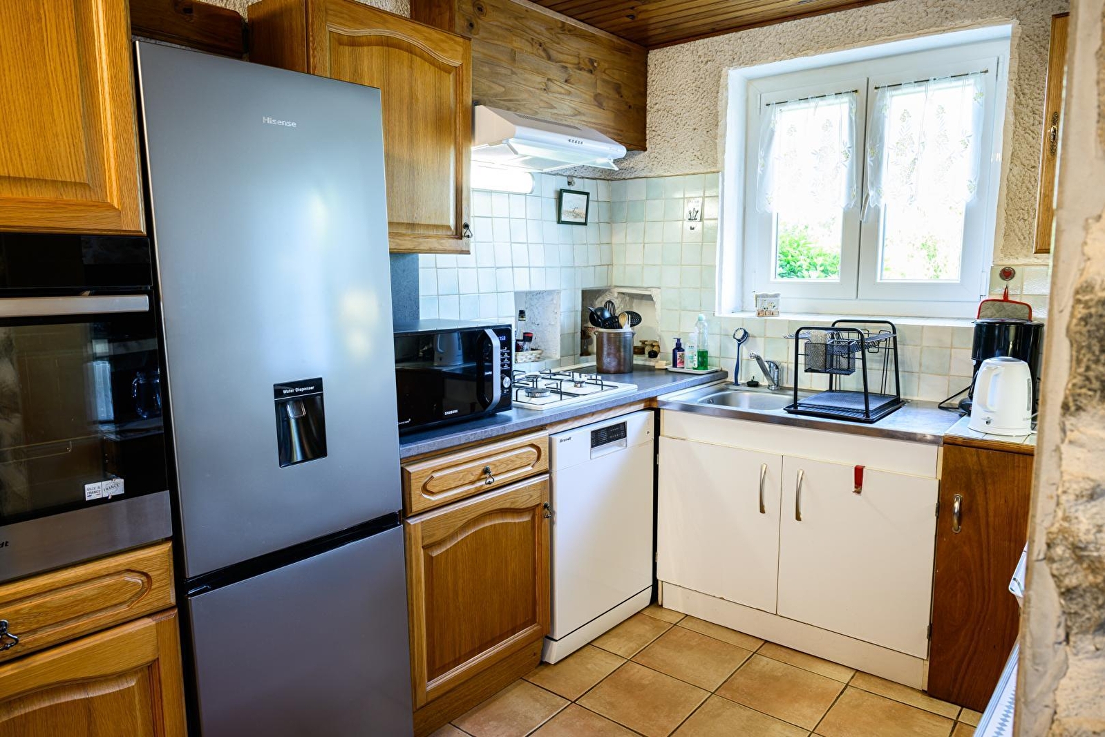 Composition : Maison individuelle voisinant logement des propriétaires + logement familial (totale indépendance sans vis-à-vis). Wifi (fibre). Chauffage PAC (+ électrique) + cheminée (système central à air pulsé). Climatisation. Rdc : séjour-cuisine-salon, 1 chambre (lit 2 p. 140x190cm), salle d‘eau PMR (douche), Wc PMR indépendant. 1er étage : 2 chambres (lit 2 p. 160x200cm / 2 lits 1 p. 90x190cm), sdb (baignoire), Wc indépendant. Terrasse + jardin (3000m²) + abri voitures + parking privés. Local vélos. Toutes commodités 5 km. Supermarché 2.5 km.