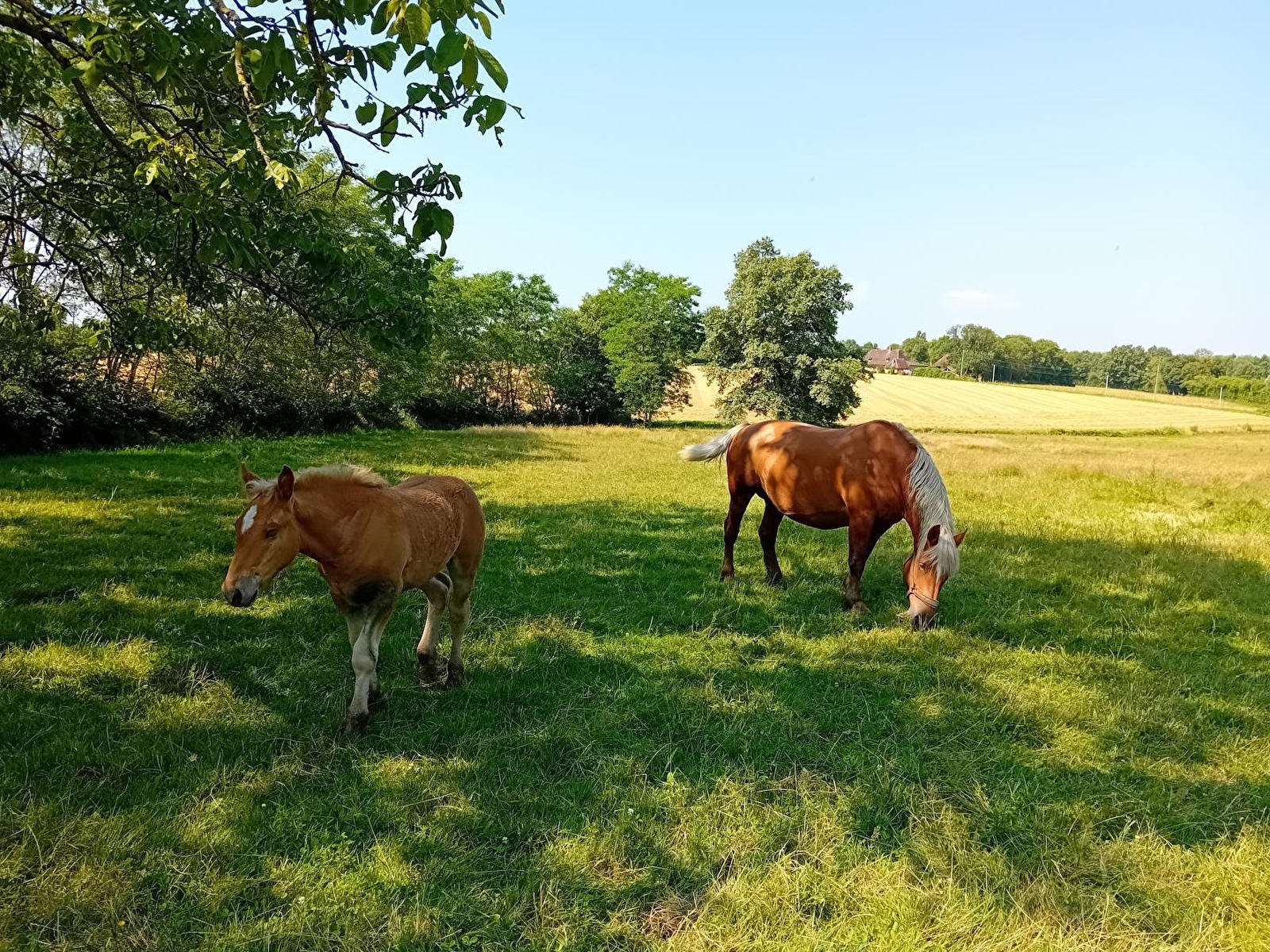 Éliane & Pierre (détenteur d'une collection littéralement unique d'une trentaine d'anciens tracteurs, visitable à deux pas !), propriétaires d'un étang de pêche privé de 1 ha sis à 2 km (carpes, brochets, tanches…), vous ouvrent les portes d'une ravissante ferme bressane traditionnelle du XIXe, à "briques & pans de bois", intégralement restaurée avec grands soins, nichée au calme au sein d'une petit hameau rural, tout à la fois résidentiel & agricole (abritant l'exploitation familiale de leur fils). Magnifique petit "coin de campagne", apaisant & ressourçant, blotti en lisière d'une bucolique pâture bordée d'arbres accueillant les chevaux des propriétaires. Littéral havre de paix & repos lové au creux d'un ravissant écrin préservé de nature & verdure, conjuguant champs de cultures, verdoyantes prairies bocagères & forêts sauvages (à parcourir lors d'apaisante balades à pied ou vélos), non loin du cœur de bourg typique de Simard, petit village bressan commerçant doté d'une majestueuse église en brique au clocher néo roman comme d'un "city-stade". Spacieux gîte de très bon confort. Chaleureux cachet campagnard sublimé par les riches traces du bâti d'origine (élégants murs en briques & pans de bois, charpente, imposant manteau de cheminée en briques…). Beaucoup de charme & de caractère. Ambiance douce & dépaysante d'une ancienne demeure. Douillet & cosy. Intimiste agréable jardin clos très soigné, arboré & engazonné, niché à l'abri des regards derrière une barrière végétale. Vaste terrasse exposée & ombragée (selon). Belle vue sur la campagne environnante.