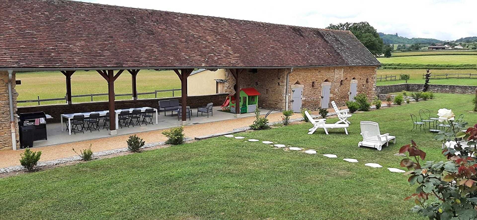 Pascal & Patricia vous ouvrent les portes d'une élégante authentique longère brionnaise du 19ème siècle chargée d'histoire, soigneusement restaurée dans les règles de l'art, sise en pleine campagne vallonnée au creux du célèbre sublime bocage charolais. Calme absolu au sein d'un paisible hameau rural « dispersé », blotti en lisière immédiate de champs, prairies & forêts. Superbe écrin paysagé totalement relaxant & apaisant, littéral petit « paradis vert » pour petits & grands. Gîte de grand confort. Ultra spacieux. Pièces aux dimensions nobles. Équipement complet de qualité. Chaleureux cachet campagnard contemporain sublimé par les riches traces du passé (majestueux manteaux de cheminée en pierre, charpente, plafond à la française, murs en pierres d'origine…). Énormément de charme & caractère. Ambiance douce & dépaysante d'une ancienne demeure mixée à un esprit cocooning & cosy. Agréable propriété soignée de 1 ha avec portail électrique comprenant une vaste terrasse panoramique abritée de 75m² (avec cuisine d'été & salon de détente « outdoor »), grand jardin engazonné & vaste espace naturel (doté d'un terrain de pétanque, balançoire & table de ping-pong). Belle vue dégagée sur la campagne environnante.