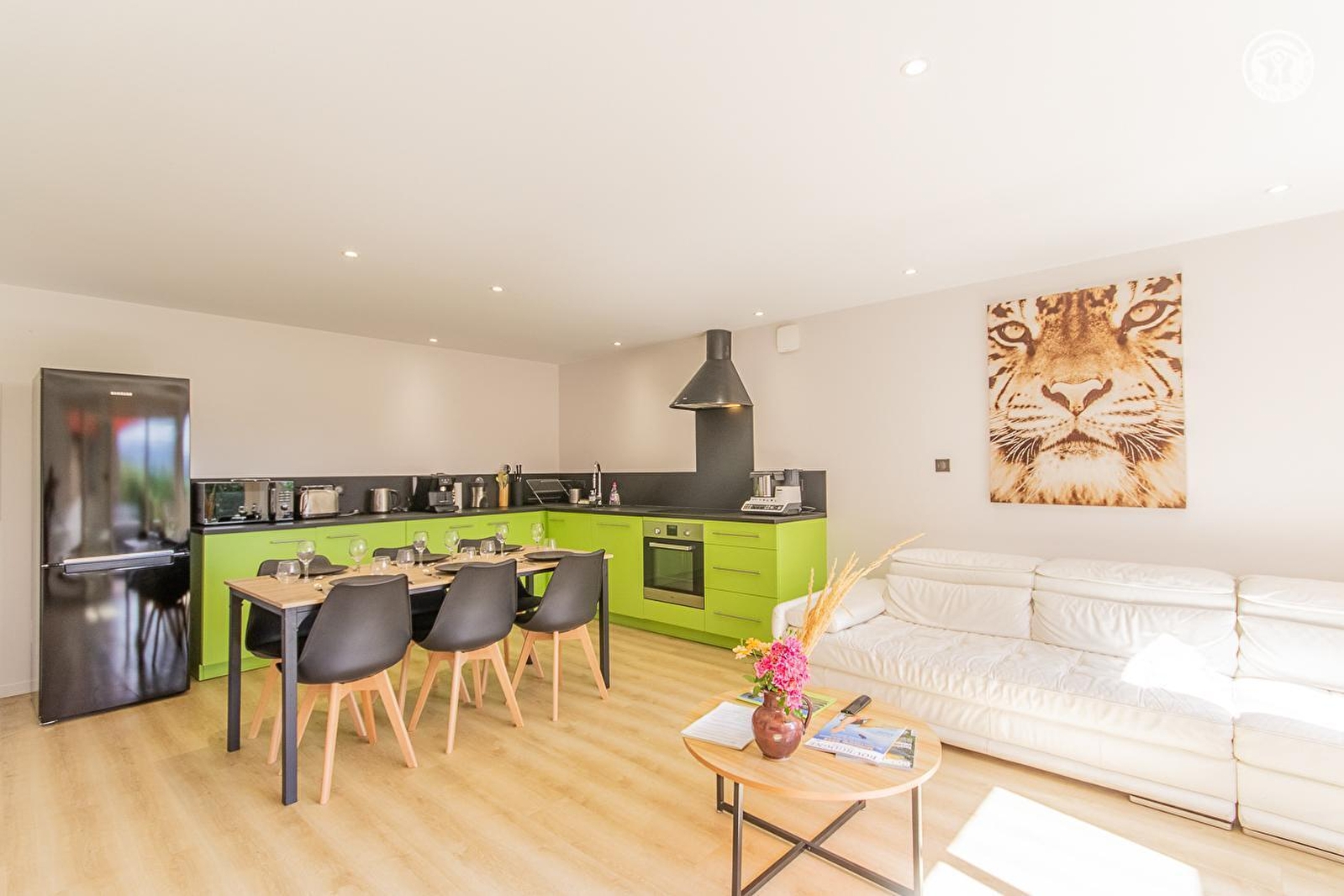 Composition : Gîte au rdc de la maison des propriétaires (indépendance totale). Wifi. Chauffage électrique. Séjour-cuisine-salon, 3 chambres ( 2 lits 1 p. 90x200 jumelables en lit 2 p. 180x200cm / lit 2 p. 160x200cm dans les 2 autres) dont 2 avec TV et une totalement indépendante (accessible par l'extérieur) avec salle d'eau privative (douche/Wc) et kitchenette complète (type studio), salle d'eau (douche), Wc indépendant, grand hall avec babyfoot. Terrasse + jardin (comprenant table ping-pong, trampoline, balançoire avec toboggan) + piscine (10x4m) + spa extérieur (5 p. / accès payant) + parking privatifs. Local vélos. Supérette à 7 km. Supermarché 11 km.