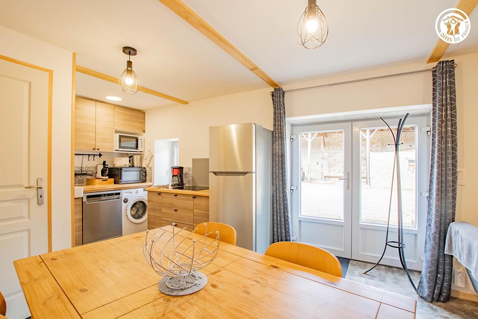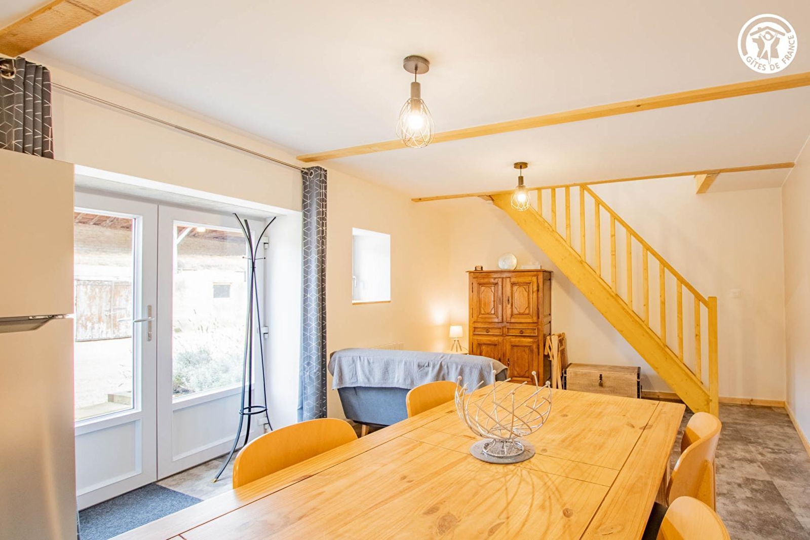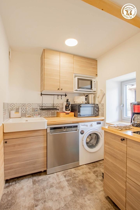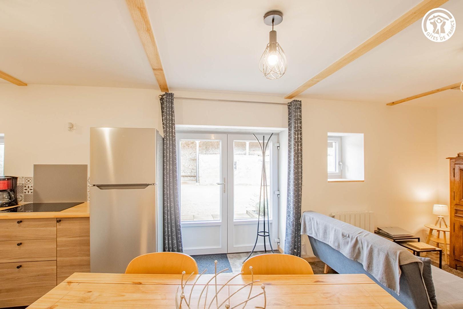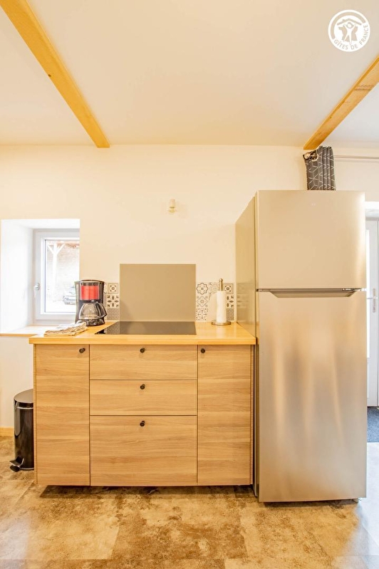 Composition : Maison individuelle jouxtant la maison des propriétaires (totale indépendance). Wifi (fibre). Chauffage électrique. Étage climatisé. Rdc : séjour-cuisine-salon, Wc indépendant. 1er étage : 2 chambres (lit 2 p. 160x200cm / 2 lits 1 p. 90x190cm superposés) dont une abritant la salle d'eau (douche). Terrasse + parking privés. Abri voitures couvert. Local vélos. Cour en commun. Petits commerces 7 km. Supermarché 9 km.