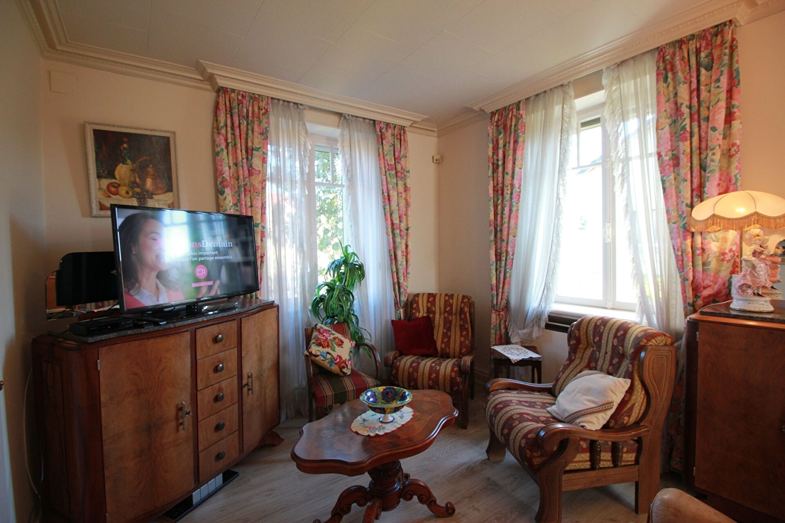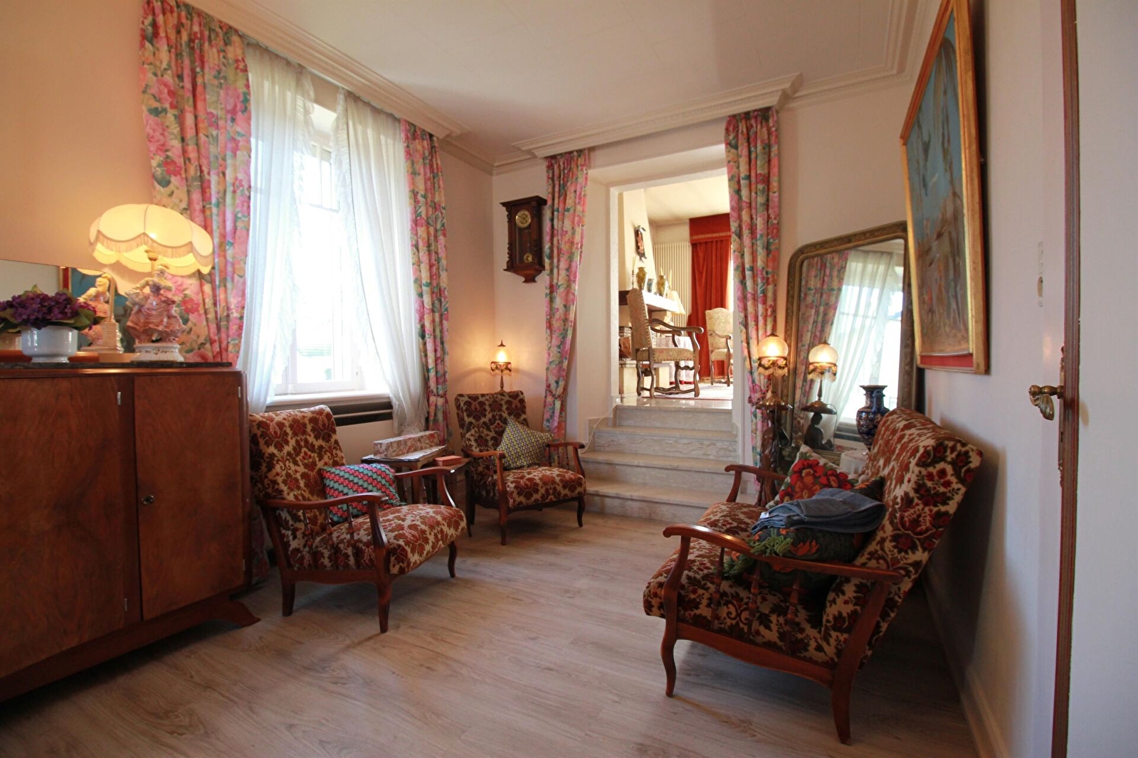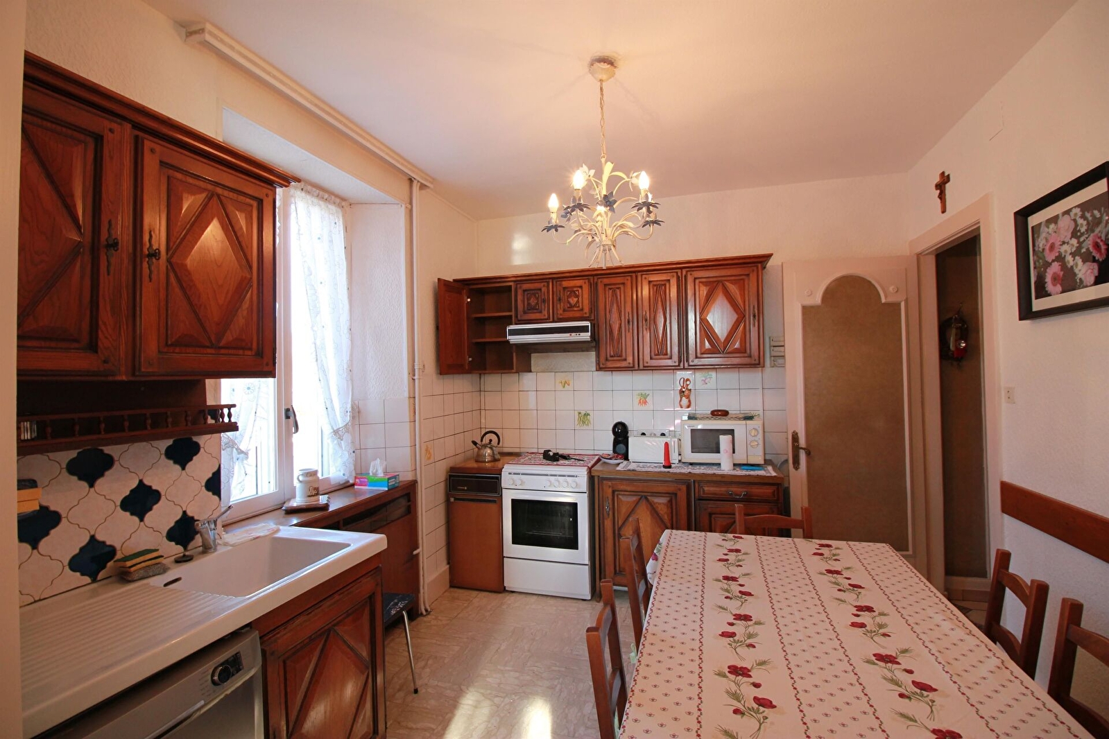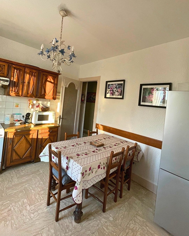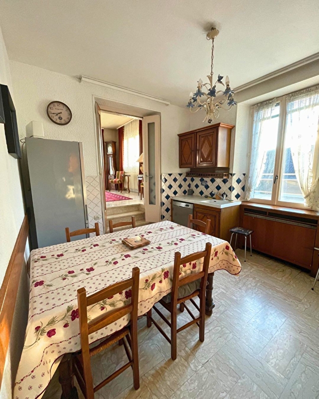La maison s'organise d'un séjour et deux salons séparés, offrant un espace agréable à vivre dans lequel ont retrouve des meubles anciens et objets de décorations. La cuisine est séparée et entièrement équipée (lave-vaisselle, four, micro-ondes, machine à café Dolce Gusto, frigo-congélateur,..) WC séparé et une chambre double au rez-de-chaussée.