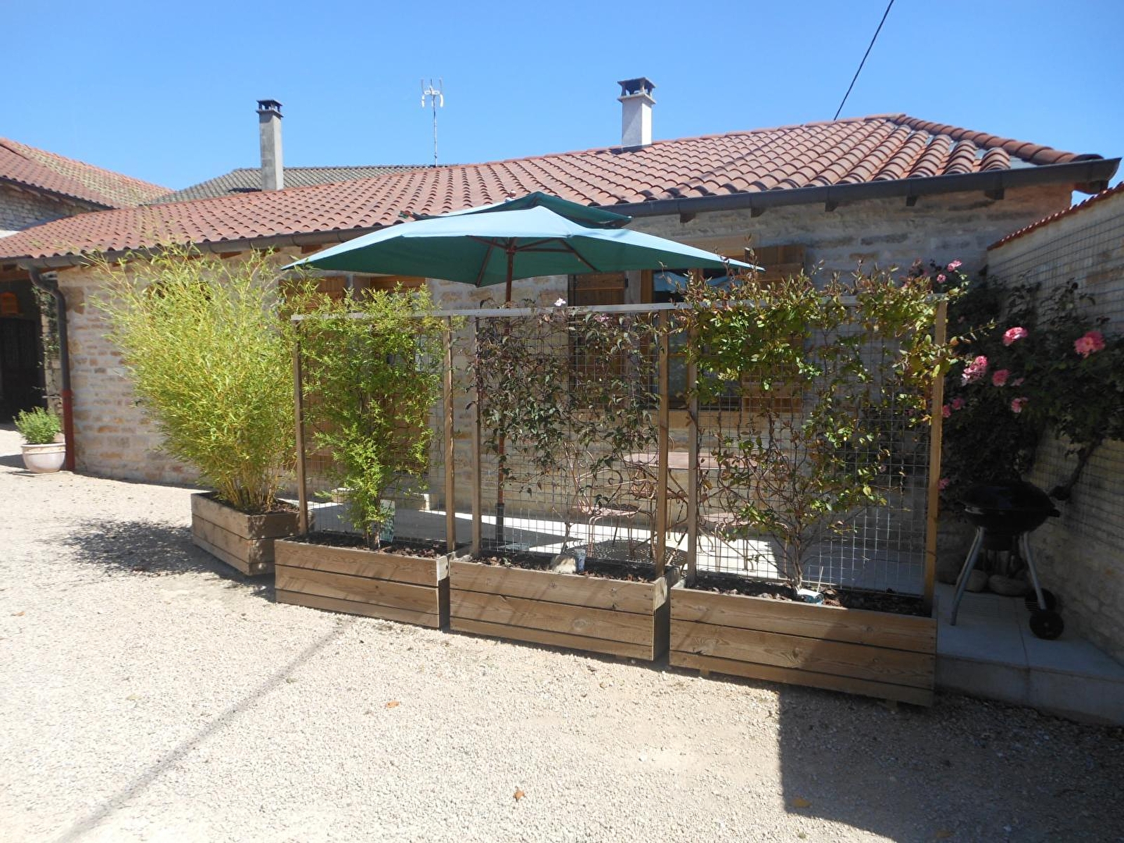 Hélène & Christian vous accueille dans une ravissante dépendance contemporaine accolée à l’authentique ancienne demeure de vignerons du XIXème siècle intégralement restaurée qu’ils occupent, blottie au calme à deux pas des vignes en bordure de ruelle au creux d’une intimiste cour "clos de murs" végétalisée & fleurie. Totale tranquillité au sein d’un paisible hameau résidentiel, aux confins du pittoresque bourg parfaitement sauvegardé de Viré (doté d’une église romane du XIIe). Niché en pleine campagne préservée, au cœur des bucoliques vignobles du haut Maçonnais, sur un site protégé en ZNIEFF pour ses richesses faunistiques & floristiques, ce charmant petit village viticole dispose de son propre AOC "Viré-Clessé" (cépage Chardonnay) comme de petits commerces & profite d'un magnifique écrin paysagé de montagne douce conjuguant coteaux de vignobles, prairies & forêts, blotti au pied de la montagne de Burgy (massif sauvage à découvrir lors de reposantes balades à pied ou VTT, offrant un exceptionnel belvédère panoramique jusqu'au Mont-Blanc par temps clair !). Spacieux gîte de bon confort. Chaleureux cachet campagnard aux accents contemporains. Cosy & douillet. Large terrasse exposée & ombragée côté cour. Accès à un agréable terrain fleuri & végétalisé, doté d’un petit verger fruitier (cerisier, poirier, groseillier, framboisier… / cueillette possible durant votre séjour ) non directement attenant (ruelle à traverser) ainsi qu’au jardin ultra soigné des propriétaires lové en lisière de vignobles, à l’arrière de la maison, abritant une belle piscine partagée (9x5m avec sa douche).