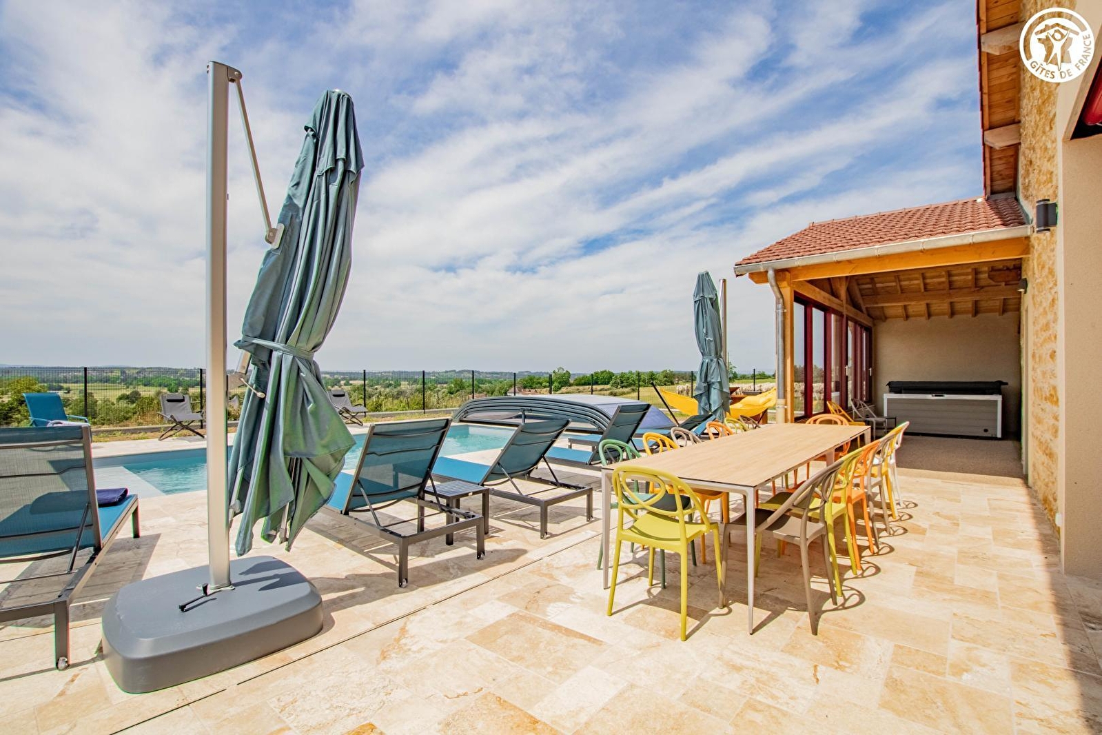 Authentique ferme traditionnelle de la fin XIXe très soigneusement restaurée blottie au calme, en "balcon" & "belvédère" panoramique à flanc de coteau ouest bien exposé, au sein d'un paisible hameau rural "dispersé" niché en pleine campagne brionnaise sur l'une des sept collines dominant le Val de Loire que compte le charmant bourg typique & commerçant d'Iguerande ("site Clunisien" riche d'une élégante église romane classée du XIIe). Magnifique cadre champêtre de bucolique bocage vallonné, lové en lisière de prairies (avec comme seules voisines, les célèbres vaches charolaises) à deux pas des rives de la Loire (magnifique espace naturel protégé pour son très riche écosystème faunistique & floristique), proche de petites forêts sauvages. Gîte de grand standing. Hyper spacieux & lumineux. Exceptionnelle pièce de vie de 70m² dotée d'un très imposant volume "cathédrale". Chaleureux cachet contemporain, cossu & raffiné. Ambiance zen & douce. Énormément de charme & caractère. Ultra cosy. Intimiste propriété close de 3000m² comprenant un grand jardin avec balançoire, belle piscine (8x4m), large terrasse (exposée & ombragée), vaste terrasse sous véranda (abritant un salon de détente & spa 5 places) et terrain de pétanque. Splendide vue dégagée sur la campagne environnante & les monts du roannais en toile de fond. Magnifique panorama & paysages. Accès à un sauna en bonus.