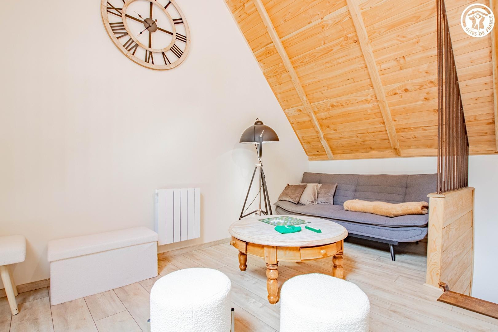 Composition : Maison individuelle sur 2 niveaux. Wifi (fibre). Chauffage électrique + poêle à bois. Rdc : séjour-cuisine, 2 chambres (lit 2 p. 160x200cm / lit 2 p. 140x190cm) dont 1 avec salle d'eau "ouverte" privative (douche/Wc indépendant), sdb (baignoire + douche), Wc indépendant, buanderie. 1er étage : salon TV en mezzanine (canapé conv. 1 p. 120x190cm en appoint), 1 chambre (4 lits 1 p. 90x190cm). Jardin clos (1000m²) + terrasse gravier + terrain pétanque + parking privés. Commodités dont supermarchés 3.5 km.