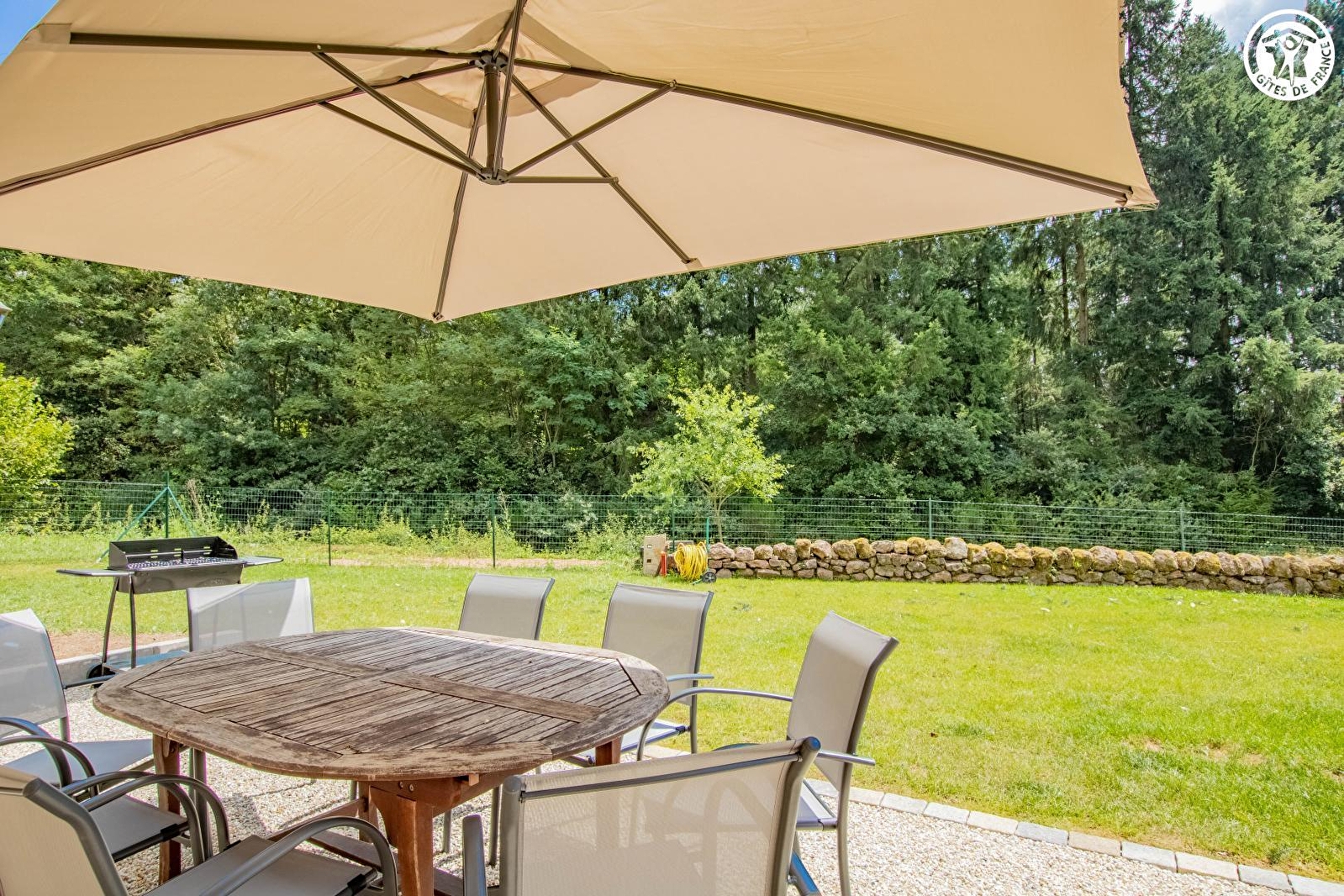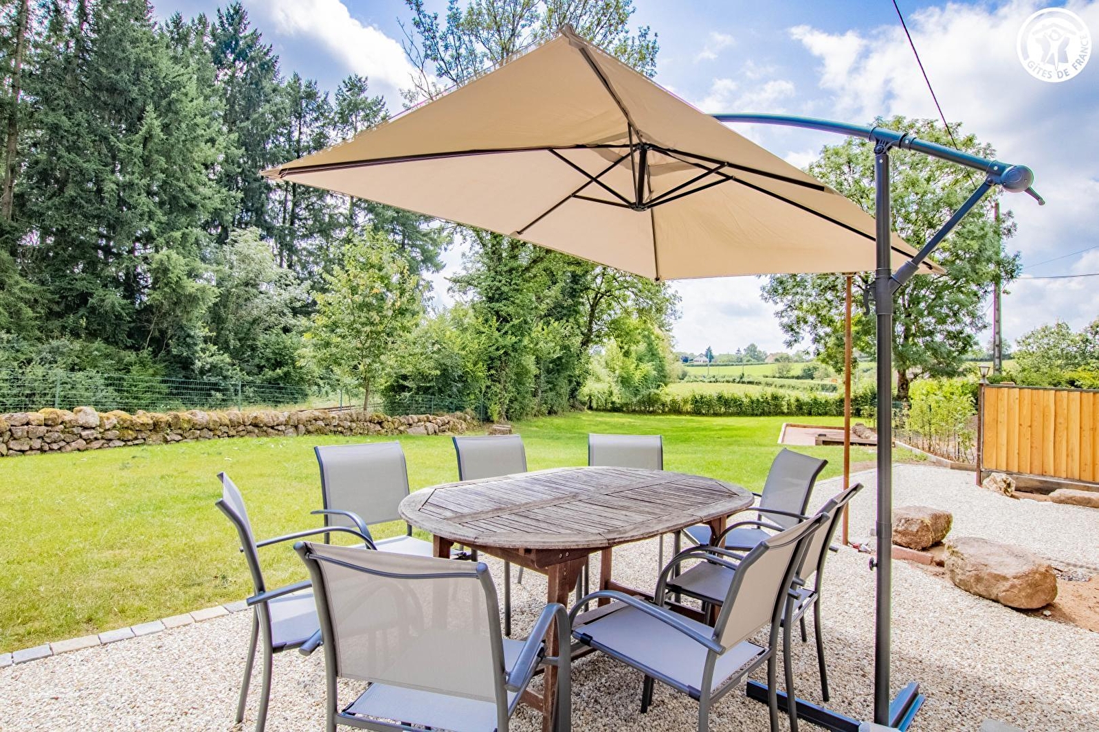 Ravissante authentique fermette traditionnelle de caractère du XVIIIe, pétrie d'histoire & soigneusement restaurée dans les règles de l'art, blottie en lisière immédiate de prairies (avec les célèbres vaches charolaises comme voisines privilégiées) & d'une insolite petite ligne de chemin de fer de "carte postale" (sans nuisance), au sein d'un paisible mini hameau rural "dispersé" sis à l'orée d'une vaste forêt sauvage protégée en ZNIEFF pour ses richesse faunistiques & floristiques. Calme & tranquillité en pleine campagne brionnaise vallonnée, mixant agriculture & pleine nature, niché au creux du bucolique bocage local boisé parsemé de rivières & étangs, à deux pas du petit village de Curbigny (& son église romane du XIIe) et du renommé somptueux Château de Drée datant de 1650 (classé MH) riche d'un sublime parc à la française de 10 ha, merveille d'architecture végétale doté d'une magnifique roseraie. Spacieux gîte de grand confort. Vaste pièce de vie au magistral "volume cathédrale". Très chaleureux cachet campagnard sublimé par l'âme dépaysante d'une ancienne demeure (conservation des originels murs en pierres, linteaux & piliers en bois, charpente, rare évier en pierre…). Élégante restauration patrimoniale. Énormément de charme & caractère. Ultra cosy & douillet. Agréable jardin clos engazonné & arboré de 1000m², véritable aire de jeux naturelle sécurisée pour les enfants, comprenant un terrain de pétanque & une intimiste large terrasse en gravier.