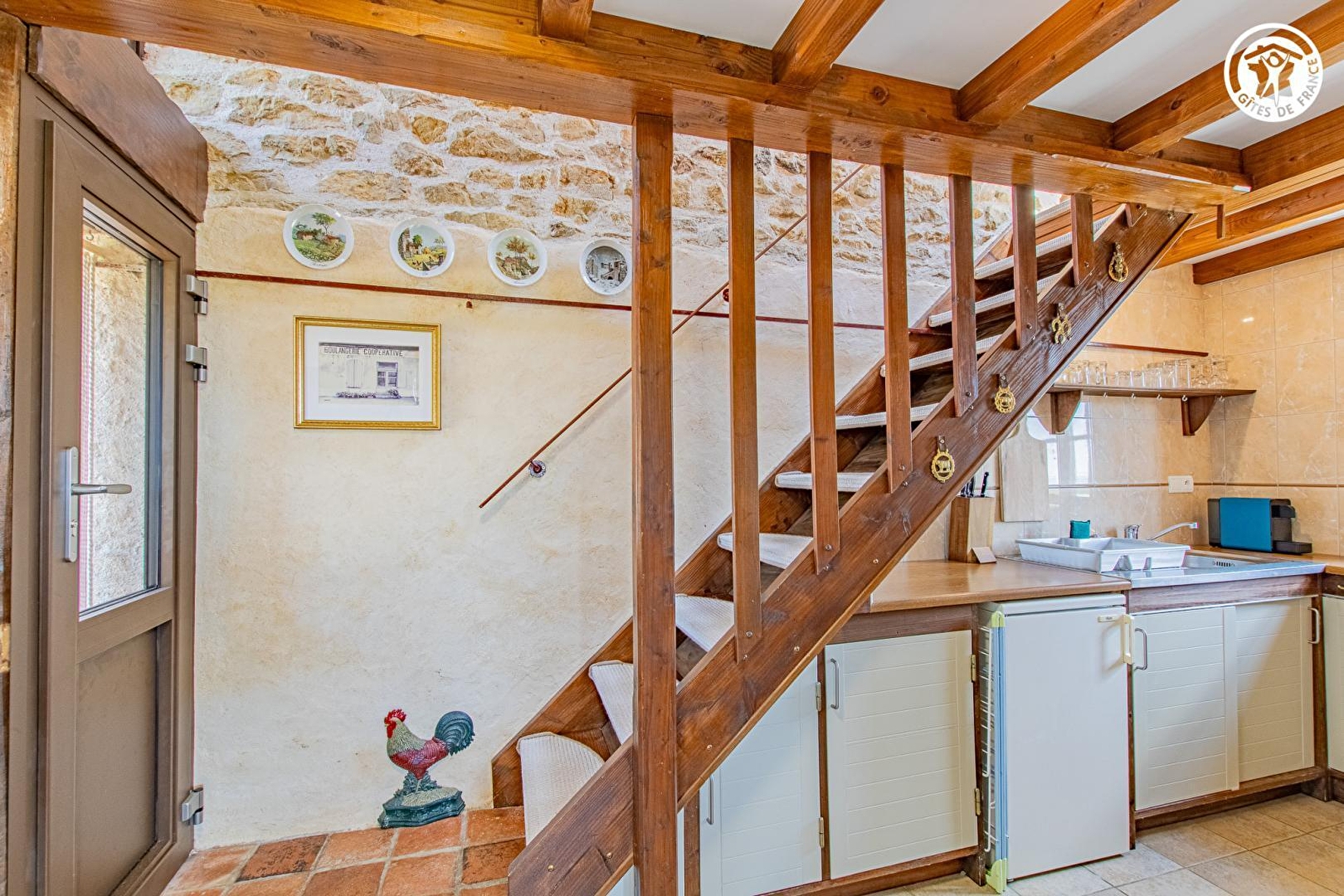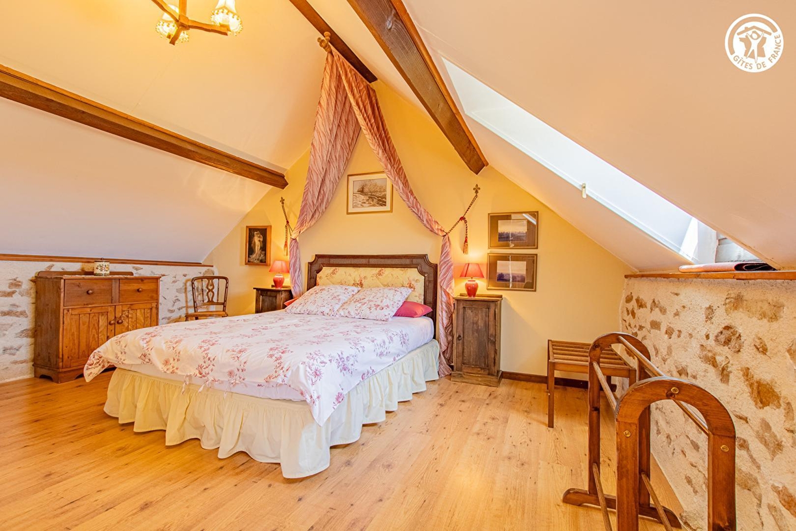 Composition : Gîte mitoyen à résidence secondaire des propriétaires (totale indépendance dans aile du bâtiment). Wifi. Chauffage électrique + poêle à bois. Gîte au 1er étage (accès de plain-pied). Rdc : cuisine, séjour-salon. 1er étage : chambre (lit 2p. 150x200cm), salle d'eau (douche/Wc). Balcon-terrasse + jardin (espace réservé) + abri couvert voitures + local vélos + parking privés. Accès en commun à l'intégralité de la propriété (dont terrain pétanque & mini bassin). Commodités dont supermarché à 9 km.