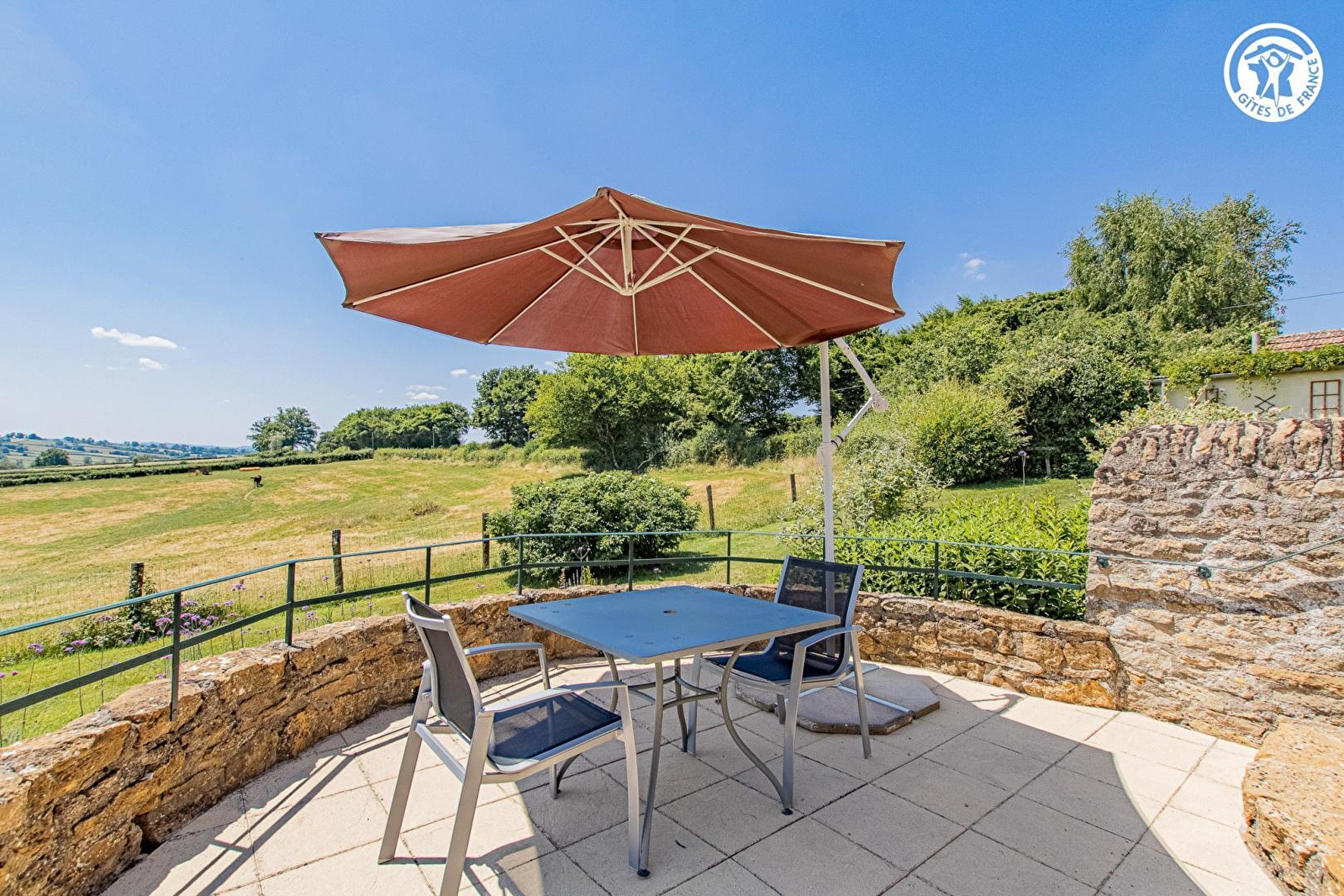 Julie & Patrick vous ouvrent les portes d'une authentique ferme traditionnelle de caractère du XIXème siècle soigneusement restaurée blottie en "vigie" à flanc d'une douce colline exposée, dominant en "belvédère panoramique" un vaste plateau de bucolique bocage boisé, aux confins d'un petit hameau rural agricole & résidentiel. Calme & absolue tranquillité en pleine campagne charolaise vallonnée, lové en impasse ("cul de sac") en lisière de pâtures (accueillant en saisons des chevaux comme voisins privilégiés), au creux d'un sublime écrin préservé de nature & verdure. Véritable "mini paradis vert" 100% relaxant, offrant le privilège rare de pouvoir observer la faune sauvage (chevreuils, lièvres, renards, rapaces, lérots, divers oiseaux…). Littéral havre de paix & repos au cœur d'un cadre d'exception. Spacieux gîte de bon confort. Chaleureux cachet campagnard un brin "vintage", sublimé par l'âme dépaysante des lieux (linteaux & murs en pierres d'origine). Atypique pièce de vie panoramique, ultra lumineuse, ouverte sur la campagne environnante. Beaucoup de charme. Ambiance cosy & douillette. Large balcon-terrasse exposé riche d'une superbe vue dégagée. Agréable jardin "privatif" ouvert sur les prés, doté d'un espace détente & repos ombragé sous canisse, niché sur une magnifique propriété soigneusement paysagée (très fleurie, végétalisée & arborée) abritant un terrain de pétanque naturellement ombragé sous les arbres & une "mini mare". Somptueux panorama & paysages.