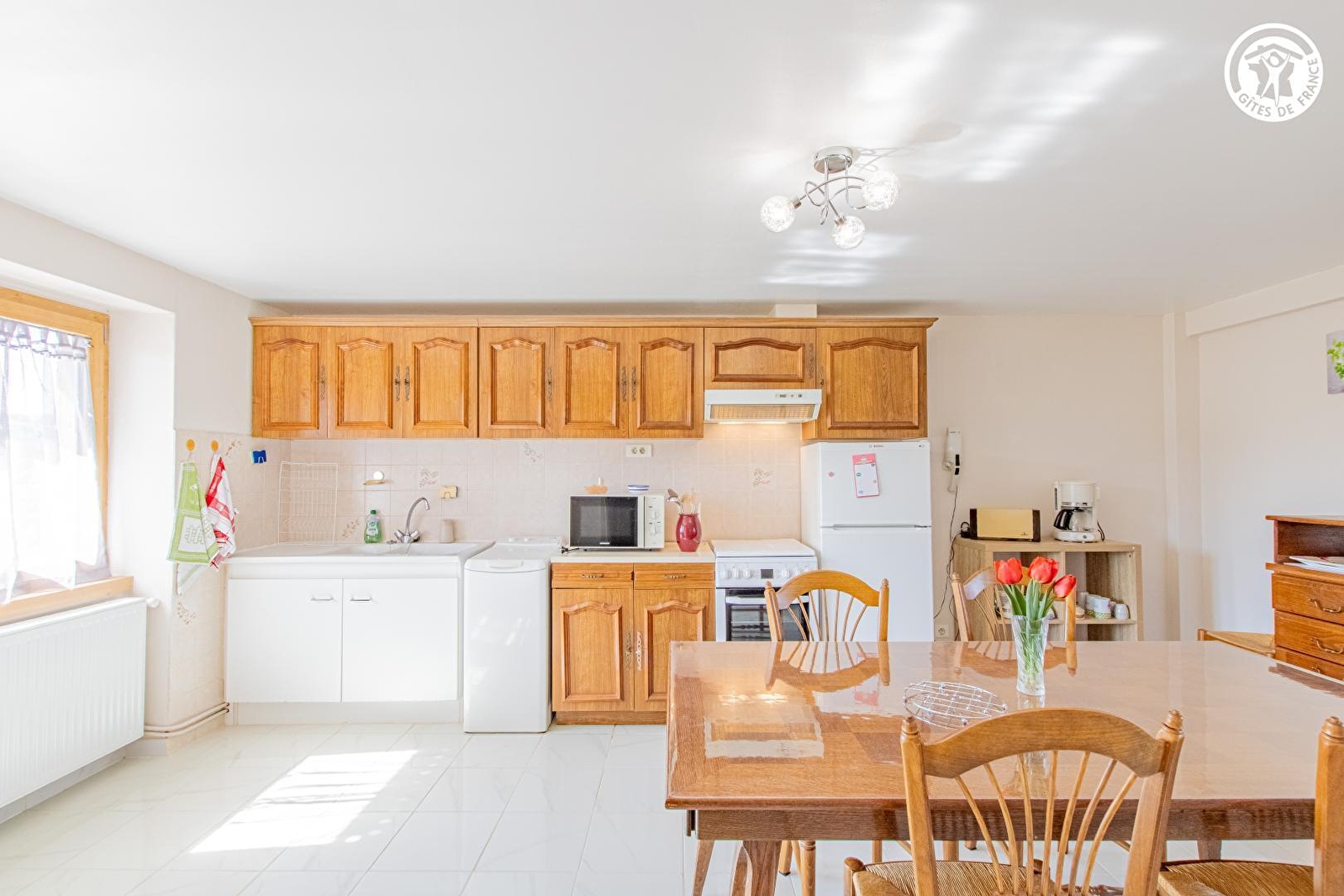 Composition : Gîte mitoyen à l'habitation des propriétaires (totale indépendance) sur exploitation agricole (comprenant des bâtiments dédiés). Wifi (fibre). Chauffage central fioul. Gîte au 1er étage (accès par escalier extérieur) : cuisine-séjour, salon TV (canapé convertible 2 p. 140x190cm), 1 chambre (1 lit 2 p. 140x190cm), salle de bain (baignoire), Wc indépendant. Balcon abrité + jardinet + parking privés. Grande cour en commun avec propriétaires. Supermarché à 12 km. Toutes commodités à 18 km.