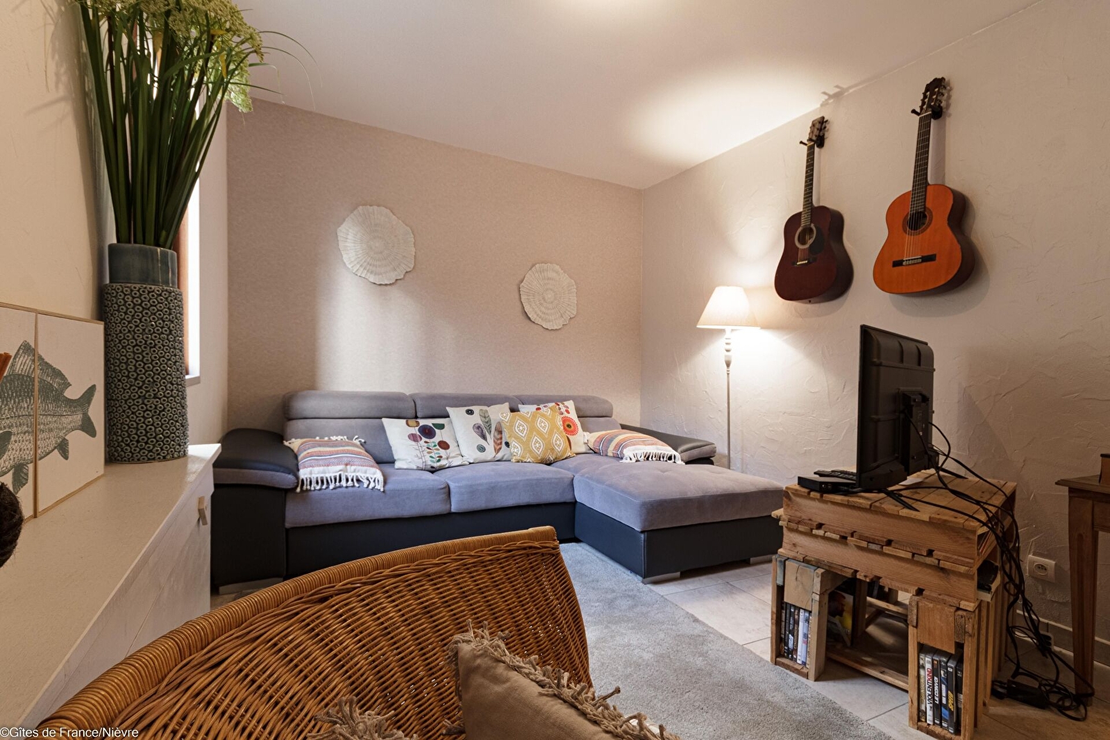Intérieur: cuisine ouverte intégrée et équipée ouverte sur séjour, une salle d'eau (douche) avec double vasque lave-linge et sèche-linge, wc. Equipement bébé. 1 chambre avec un lit 90x190 et 2 lits superposés 90x190, 1 chambre avec 1 lit 160x200, 1 chambre avec 1 lit 160x200 et sa salle d'eau privative accessible aux personnes à mobilité réduite (douche et wc), un salon avec télé, lecteur dvd et 2 guitares.